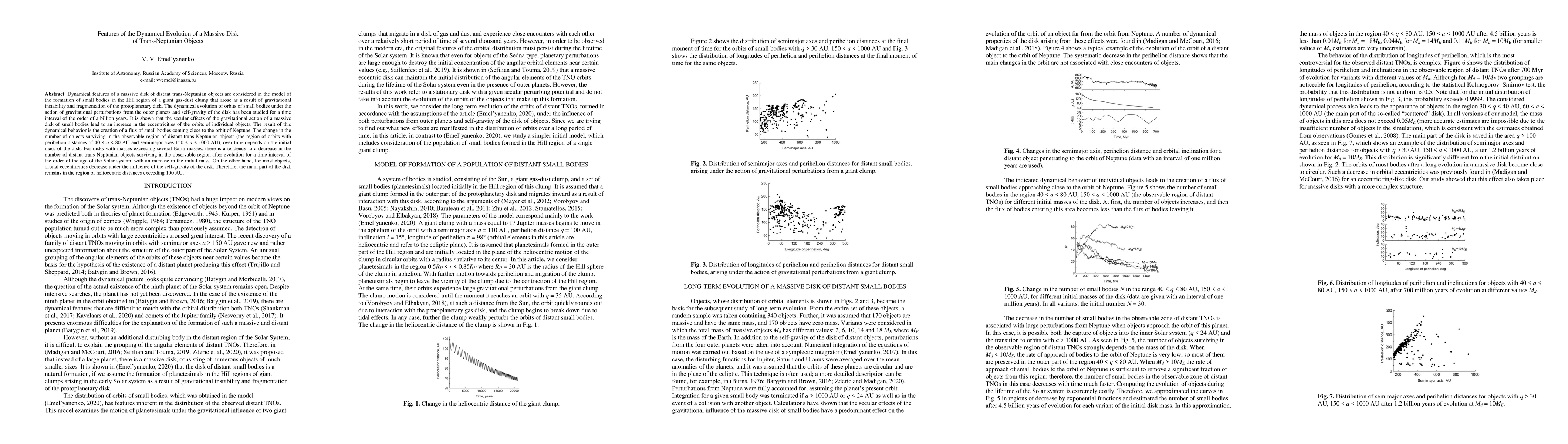 Dynamical features of a massive disk of distant trans-Neptunian objects are considered in the model of the formation of small bodies in the Hill region of a giant gas-dust clump that arose as a result of gravitational instability and fragmentation of the protoplanetary disk. The dynamical evolution of orbits of small bodies under the action of gravitational perturbations from the outer planets and self-gravity of the disk has been studied for a time interval of the order of a billion years. It is shown that the secular effects of the gravitational action of a massive disk of small bodies lead to an increase in the eccentricities of the orbits of individual objects. The result of this dynamical behavior is the creation of a flux of small bodies coming close to the orbit of Neptune. The change in the number of objects surviving in the observable region of distant trans-Neptunian objects (the region of orbits with perihelion distances of 40 < q < 80 AU and semimajor axes 150 < a < 1000 AU), over time depends on the initial mass of the disk. For disks with masses exceeding several Earth masses, there is a tendency to a decrease in the number of distant trans-Neptunian objects surviving in the observable region after evolution for a time interval of the order of the age of the Solar system, with an increase in the initial mass. On the other hand, for most objects, orbital eccentricities decrease under the influence of the self-gravity of the disk. Therefore, the main part of the disk remains in the region of heliocentric distances exceeding 100 AU.