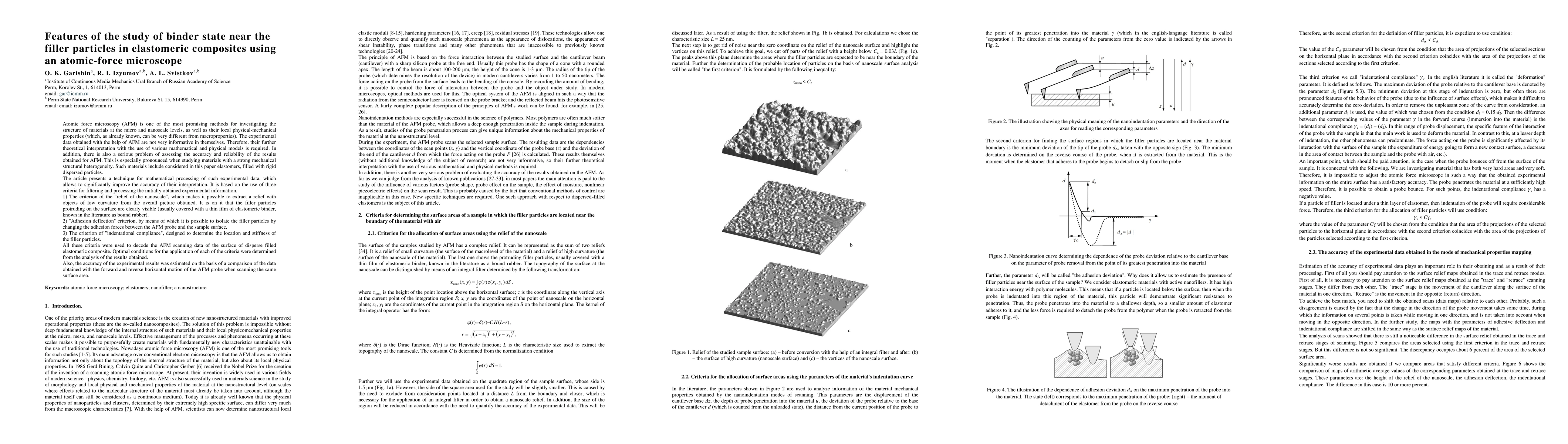 This paper utilizes atomic force microscopy (AFM) to study the binder state near filler particles in elastomeric composites, proposing a mathematical processing technique to enhance the accuracy of AFM data interpretation. The technique employs three criteria: "relief of the nanoscale," "adhesion deflection," and "indentational compliance" to isolate and analyze filler particles and bound rubber, improving the reliability of nanoscale structural analysis.