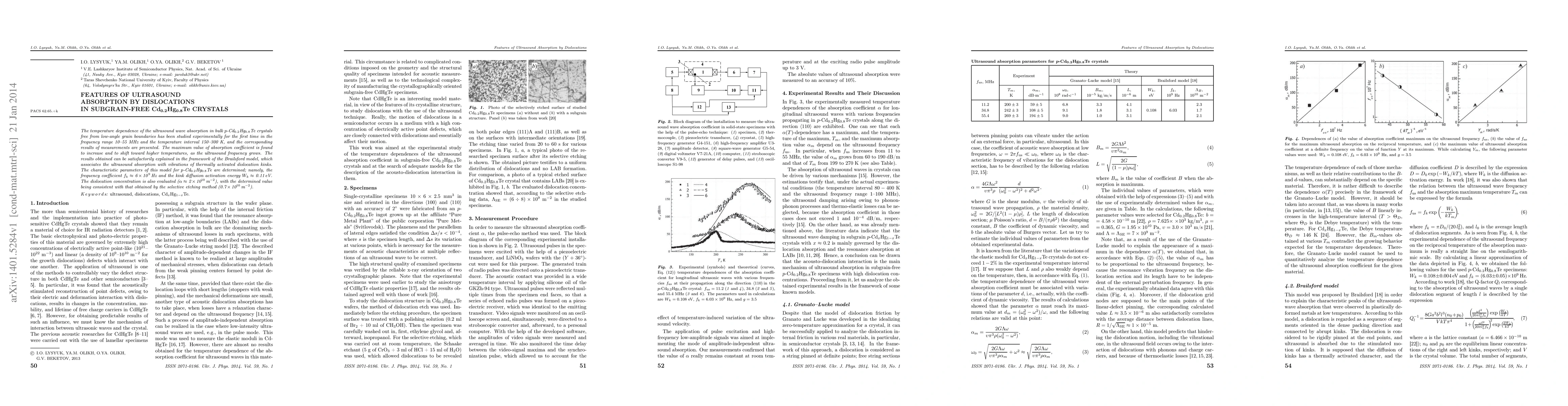 This study investigates the temperature-dependent ultrasound absorption in subgrain-free $p$-Cd$_{0.2}$Hg$_{0.8}$Te crystals, revealing a frequency-dependent increase in absorption coefficient. The findings align with the Brailsford model, determining key parameters like frequency coefficient $f_{k}$ and kink diffusion activation energy $W_{k}$.