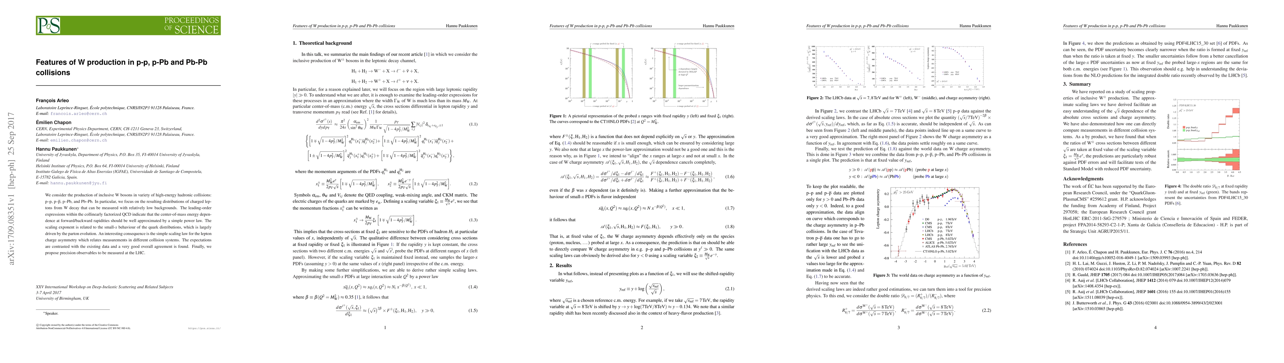 We consider the production of inclusive W bosons in variety of high-energy hadronic collisions: p--p, p--$\overline{\rm p}$, p--Pb, and Pb--Pb. In particular, we focus on the resulting distributions of charged leptons from W decay that can be measured with relatively low backgrounds. The leading-order expressions within the collinearly factorized QCD indicate that the center-of-mass energy dependence at forward/backward rapidities should be well approximated by a simple power law. The scaling exponent is related to the small-$x$ behaviour of the quark distributions, which is largely driven by the parton evolution. An interesting consequence is the simple scaling law for the lepton charge asymmetry which relates measurements in different collision systems. The expectations are contrasted with the existing data and a very good overall agreement is found. Finally, we propose precision observables to be measured at the LHC.