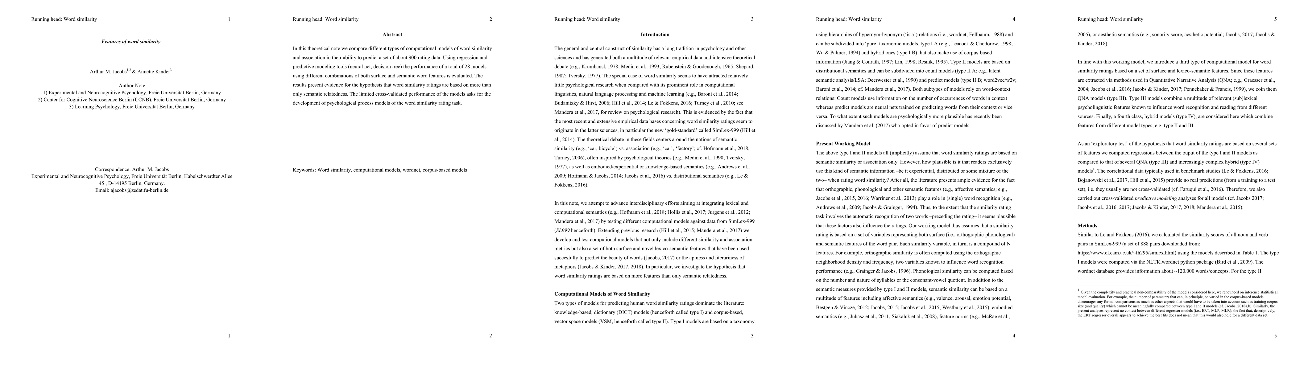 In this theoretical note we compare different types of computational models of word similarity and association in their ability to predict a set of about 900 rating data. Using regression and predictive modeling tools (neural net, decision tree) the performance of a total of 28 models using different combinations of both surface and semantic word features is evaluated. The results present evidence for the hypothesis that word similarity ratings are based on more than only semantic relatedness. The limited cross-validated performance of the models asks for the development of psychological process models of the word similarity rating task.