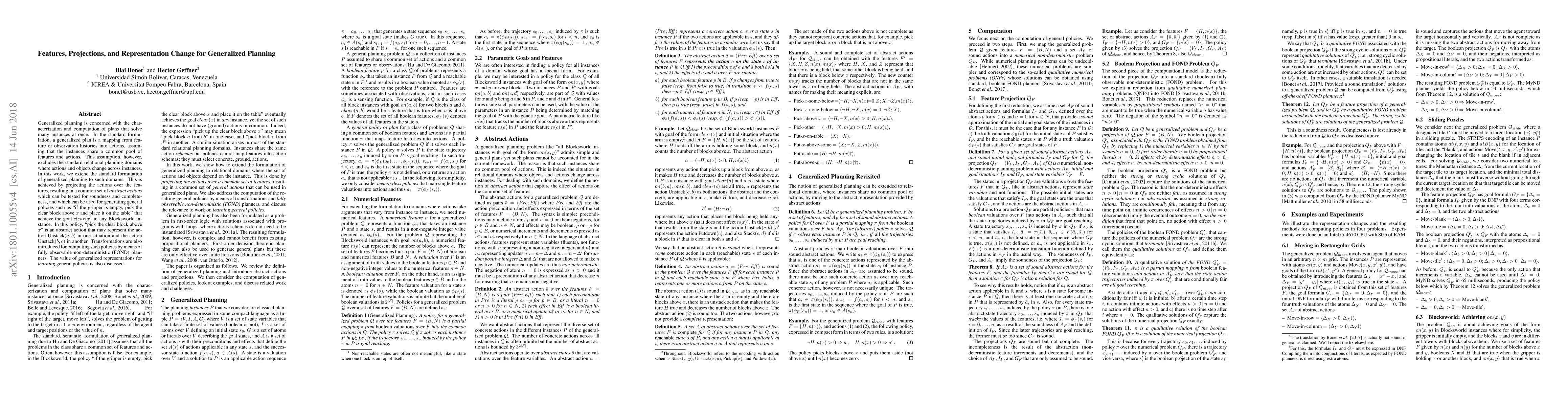 This paper extends generalized planning to domains where actions and objects change across instances by projecting actions over features, creating a common set of abstract actions. It introduces transformations for generating general policies using fully observable non-deterministic planners and discusses the value of these representations for learning general policies.