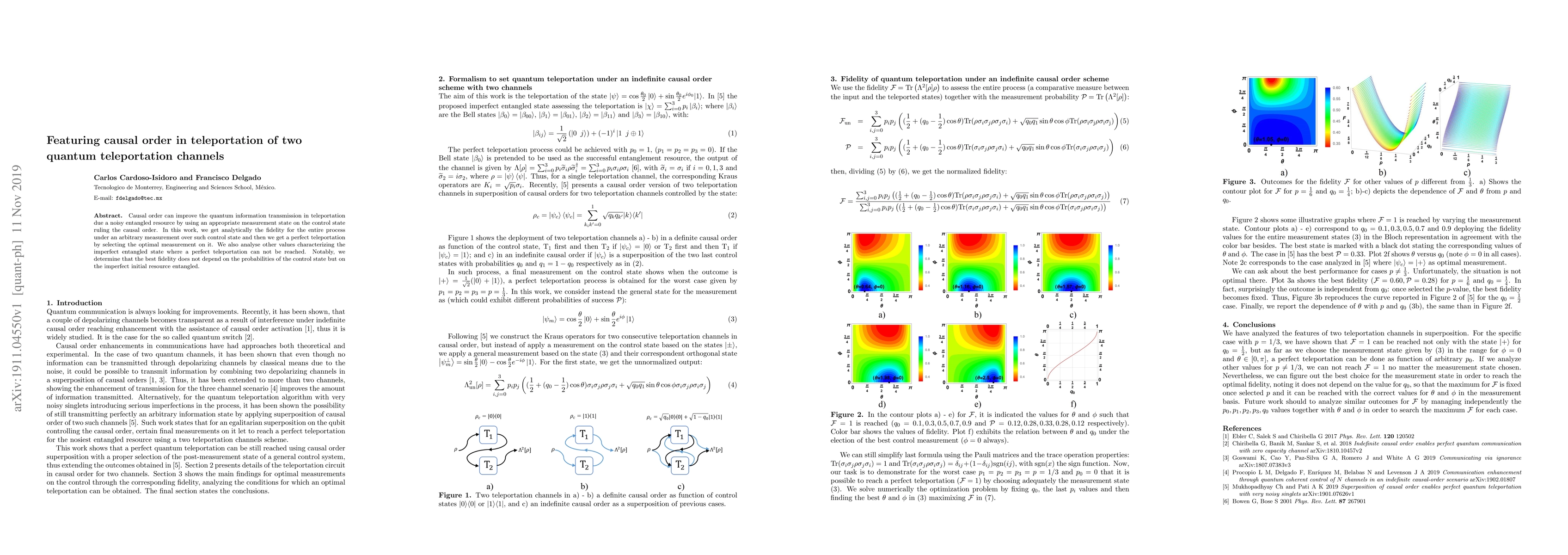 Causal order can improve the quantum information transmission in teleportation due a noisy entangled resource by using an appropriate measurement state on the control state ruling the causal order. In this work, we get analytically the fidelity for the entire process under an arbitrary measurement over such control state and then we get a perfect teleportation by selecting the optimal measurement on it. We also analyse other values characterizing the imperfect entangled state where a perfect teleportation can not be reached. Notably, we determine that the best fidelity does not depend on the probabilities of the control state but on the imperfect initial resource entangled.