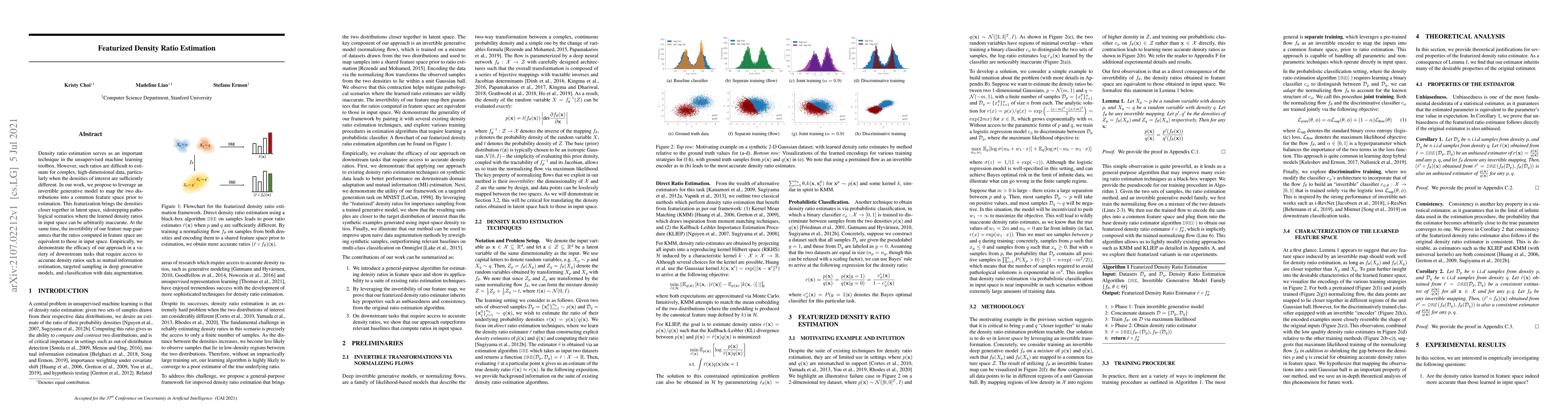 Density ratio estimation serves as an important technique in the unsupervised machine learning toolbox. However, such ratios are difficult to estimate for complex, high-dimensional data, particularly when the densities of interest are sufficiently different. In our work, we propose to leverage an invertible generative model to map the two distributions into a common feature space prior to estimation. This featurization brings the densities closer together in latent space, sidestepping pathological scenarios where the learned density ratios in input space can be arbitrarily inaccurate. At the same time, the invertibility of our feature map guarantees that the ratios computed in feature space are equivalent to those in input space. Empirically, we demonstrate the efficacy of our approach in a variety of downstream tasks that require access to accurate density ratios such as mutual information estimation, targeted sampling in deep generative models, and classification with data augmentation.
