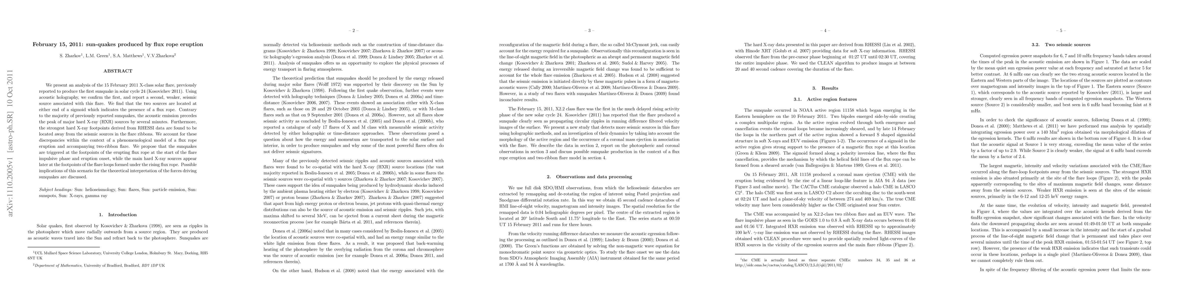 We present an analysis of the 15 February 2011 X-class solar flare, previously reported to produce the first sunquake in solar cycle 24 (Kosovichev 2011). Using acoustic holography, we confirm the first, and report a second, weaker, seismic source associated with this flare. We find that the two sources are located at either end of a sigmoid which indicates the presence of a flux rope. Contrary to the majority of previously reported sunquakes, the acoustic emission precedes the peak of major hard X-ray (HXR) sources by several minutes. Furthermore, the strongest hard X-ray footpoints derived from RHESSI data are found to be located away from the seismic sources in the flare ribbons. We account for these discrepancies within the context of a phenomenological model of a flux rope eruption and accompanying two-ribbon flare. We propose that the sunquakes are triggered at the footpoints of the erupting flux rope at the start of the flare impulsive phase and eruption onset, while the main hard X-ray sources appear later at the footpoints of the flare loops formed under the rising flux rope. Possible implications of this scenario for the theoretical interpretation of the forces driving sunquakes are discussed.