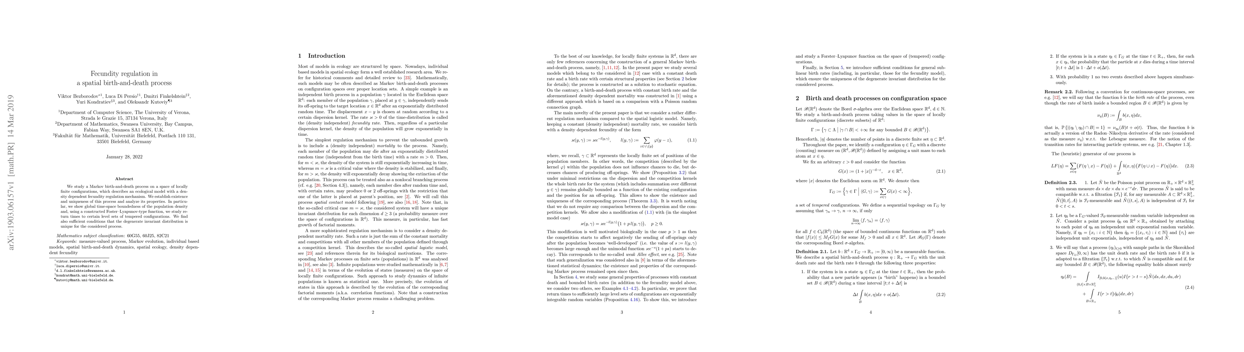 We study a Markov birth-and-death process on a space of locally finite configurations, which describes an ecological model with a density dependent fecundity regulation mechanism. We establish existence and uniqueness of this process and analyze its properties. In particular, we show global time-space boundedness of the population density and, using a constructed Foster-Lyapunov-type function, we study return times to certain level sets of tempered configurations. We find also sufficient conditions that the degenerate invariant distribution is unique for the considered process.