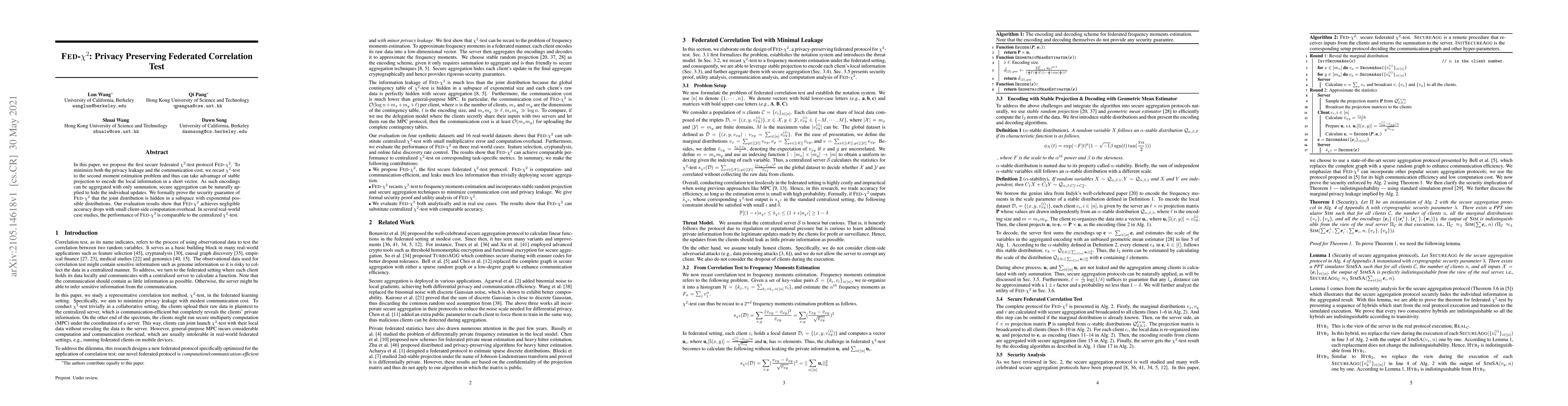 In this paper, we propose the first secure federated $\chi^2$-test protocol Fed-$\chi^2$. To minimize both the privacy leakage and the communication cost, we recast $\chi^2$-test to the second moment estimation problem and thus can take advantage of stable projection to encode the local information in a short vector. As such encodings can be aggregated with only summation, secure aggregation can be naturally applied to hide the individual updates. We formally prove the security guarantee of Fed-$\chi^2$ that the joint distribution is hidden in a subspace with exponential possible distributions. Our evaluation results show that Fed-$\chi^2$ achieves negligible accuracy drops with small client-side computation overhead. In several real-world case studies, the performance of Fed-$\chi^2$ is comparable to the centralized $\chi^2$-test.