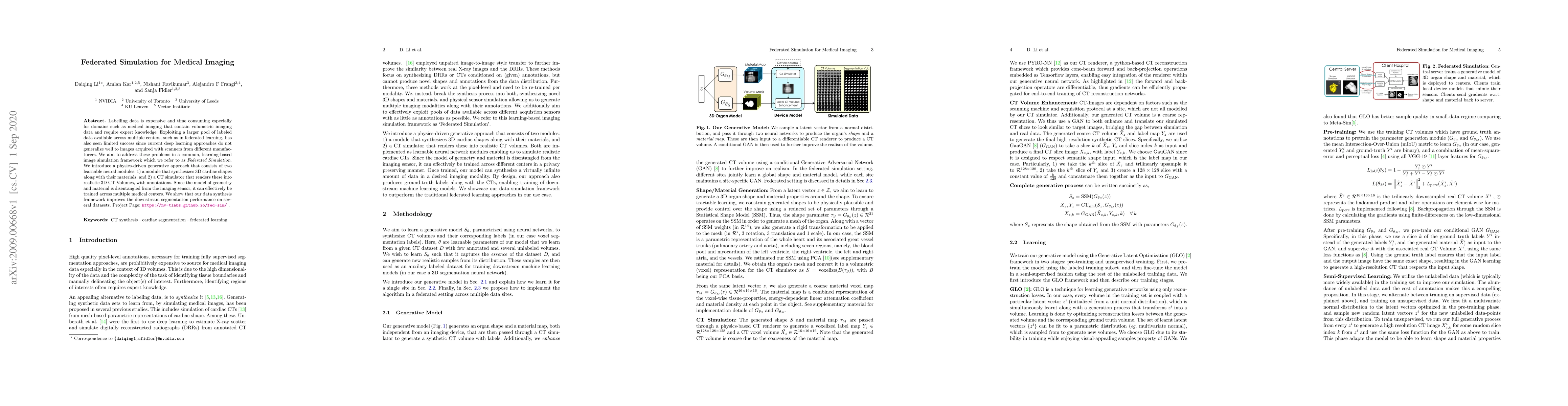Labelling data is expensive and time consuming especially for domains such as medical imaging that contain volumetric imaging data and require expert knowledge. Exploiting a larger pool of labeled data available across multiple centers, such as in federated learning, has also seen limited success since current deep learning approaches do not generalize well to images acquired with scanners from different manufacturers. We aim to address these problems in a common, learning-based image simulation framework which we refer to as Federated Simulation. We introduce a physics-driven generative approach that consists of two learnable neural modules: 1) a module that synthesizes 3D cardiac shapes along with their materials, and 2) a CT simulator that renders these into realistic 3D CT Volumes, with annotations. Since the model of geometry and material is disentangled from the imaging sensor, it can effectively be trained across multiple medical centers. We show that our data synthesis framework improves the downstream segmentation performance on several datasets. Project Page: https://nv-tlabs.github.io/fed-sim/ .