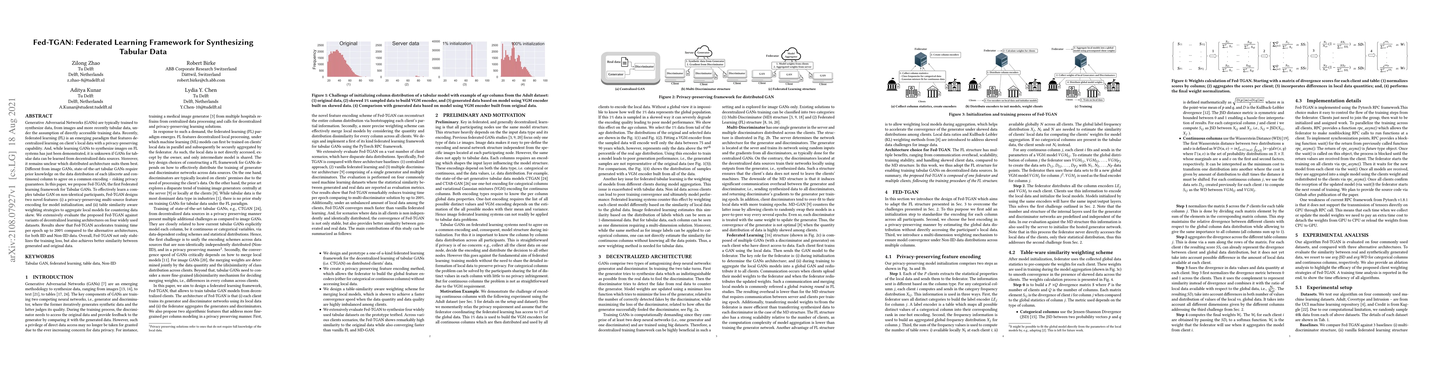 Fed-TGAN is a federated learning framework for synthesizing tabular data using GANs. It introduces privacy-preserving multi-source feature encoding and table similarity-aware weighting strategies to effectively train GANs on decentralized data, achieving up to 200% faster training times and better data similarity compared to alternative architectures.