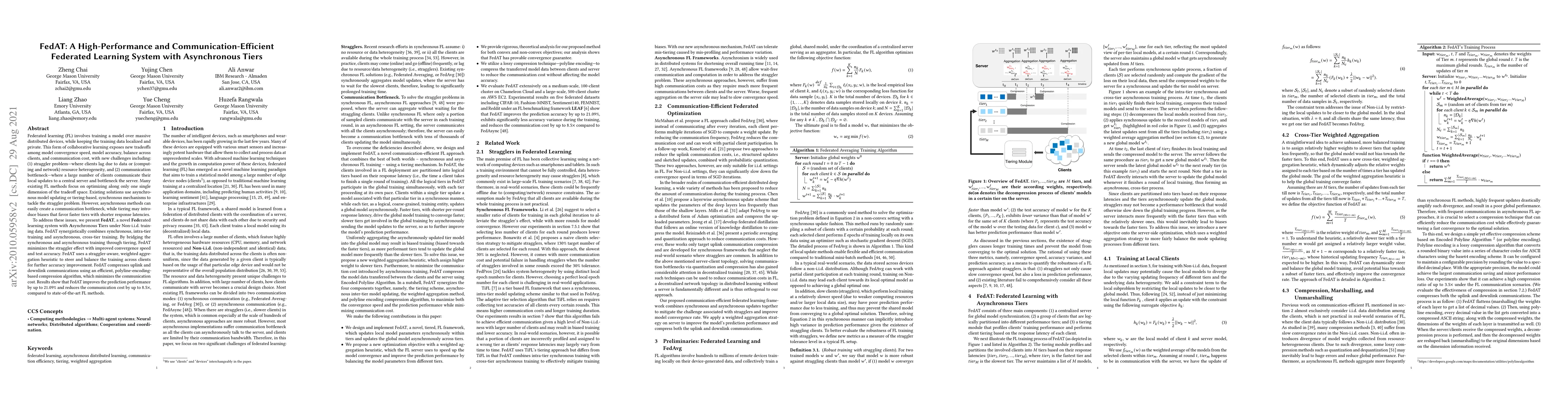 FedAT introduces a novel federated learning system with asynchronous tiers to tackle the straggler problem and communication bottleneck, achieving improved convergence speed, model accuracy, and communication efficiency. It combines synchronous intra-tier and asynchronous cross-tier training, along with a weighted aggregation heuristic and polyline-encoding compression, outperforming existing methods by up to 21.09% in prediction performance and reducing communication costs by up to 8.5x.