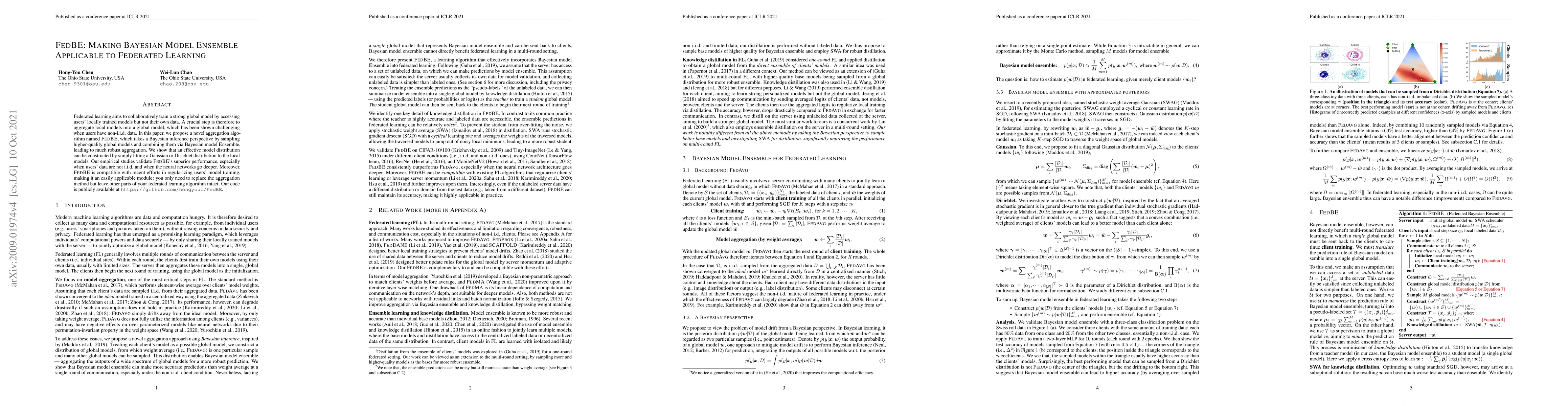 Federated learning aims to collaboratively train a strong global model by accessing users' locally trained models but not their own data. A crucial step is therefore to aggregate local models into a global model, which has been shown challenging when users have non-i.i.d. data. In this paper, we propose a novel aggregation algorithm named FedBE, which takes a Bayesian inference perspective by sampling higher-quality global models and combining them via Bayesian model Ensemble, leading to much robust aggregation. We show that an effective model distribution can be constructed by simply fitting a Gaussian or Dirichlet distribution to the local models. Our empirical studies validate FedBE's superior performance, especially when users' data are not i.i.d. and when the neural networks go deeper. Moreover, FedBE is compatible with recent efforts in regularizing users' model training, making it an easily applicable module: you only need to replace the aggregation method but leave other parts of your federated learning algorithm intact. Our code is publicly available at https://github.com/hongyouc/FedBE.