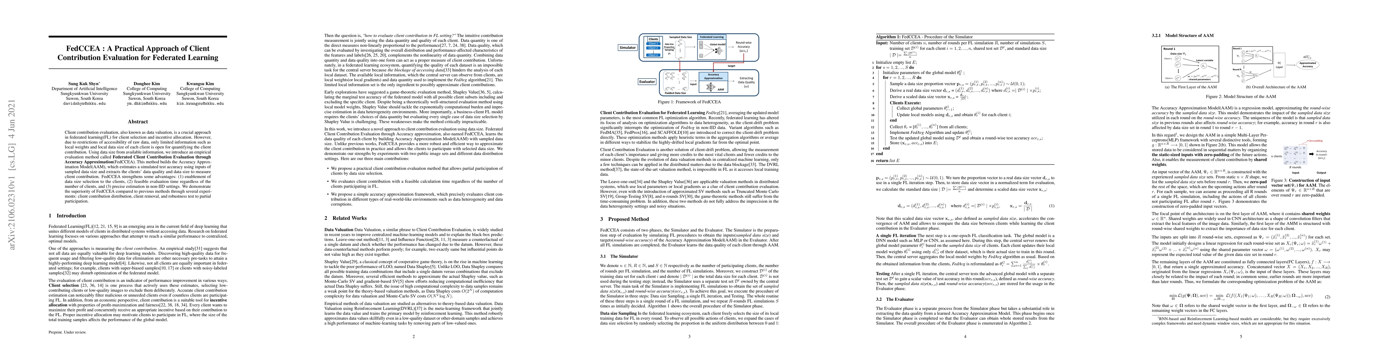 Client contribution evaluation, also known as data valuation, is a crucial approach in federated learning(FL) for client selection and incentive allocation. However, due to restrictions of accessibility of raw data, only limited information such as local weights and local data size of each client is open for quantifying the client contribution. Using data size from available information, we introduce an empirical evaluation method called Federated Client Contribution Evaluation through Accuracy Approximation(FedCCEA). This method builds the Accuracy Approximation Model(AAM), which estimates a simulated test accuracy using inputs of sampled data size and extracts the clients' data quality and data size to measure client contribution. FedCCEA strengthens some advantages: (1) enablement of data size selection to the clients, (2) feasible evaluation time regardless of the number of clients, and (3) precise estimation in non-IID settings. We demonstrate the superiority of FedCCEA compared to previous methods through several experiments: client contribution distribution, client removal, and robustness test to partial participation.