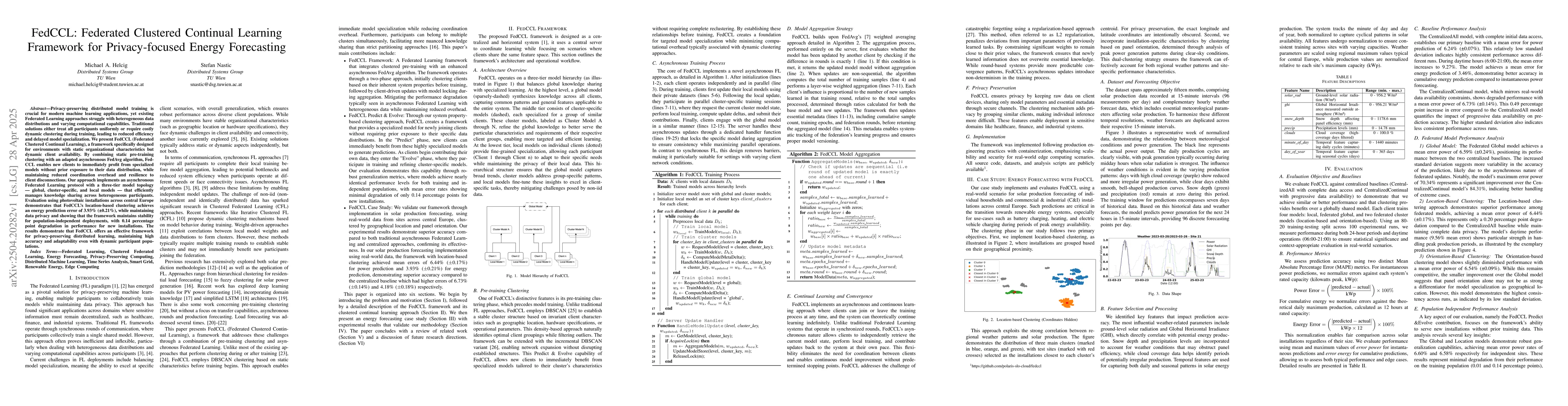 The paper introduces FedCCL, a federated learning framework combining static pre-training clustering with an adapted asynchronous FedAvg algorithm for energy forecasting, focusing on privacy and efficiency in environments with static organizational characteristics but dynamic client availability.