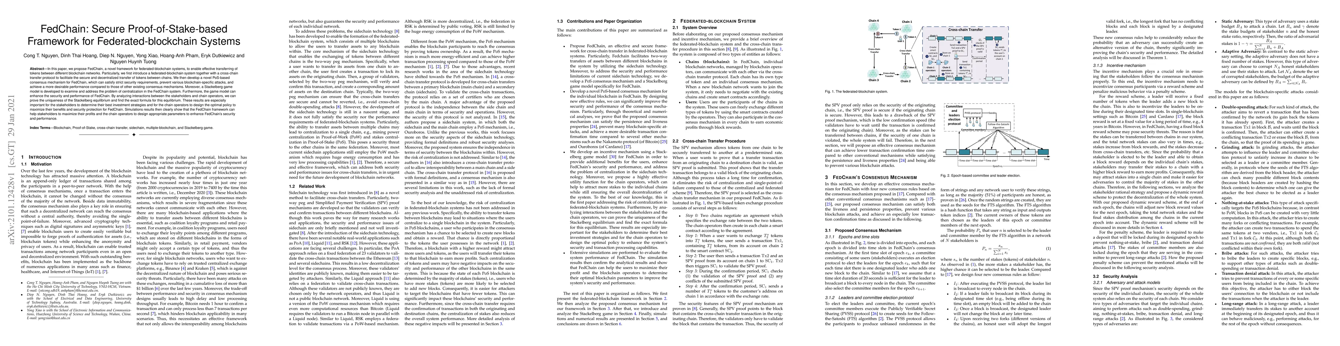 In this paper, we propose FedChain, a novel framework for federated-blockchain systems, to enable effective transferring of tokens between different blockchain networks. Particularly, we first introduce a federated-blockchain system together with a cross-chain transfer protocol to facilitate the secure and decentralized transfer of tokens between chains. We then develop a novel PoS-based consensus mechanism for FedChain, which can satisfy strict security requirements, prevent various blockchain-specific attacks, and achieve a more desirable performance compared to those of other existing consensus mechanisms. Moreover, a Stackelberg game model is developed to examine and address the problem of centralization in the FedChain system. Furthermore, the game model can enhance the security and performance of FedChain. By analyzing interactions between the stakeholders and chain operators, we can prove the uniqueness of the Stackelberg equilibrium and find the exact formula for this equilibrium. These results are especially important for the stakeholders to determine their best investment strategies and for the chain operators to design the optimal policy to maximize their benefits and security protection for FedChain. Simulations results then clearly show that the FedChain framework can help stakeholders to maximize their profits and the chain operators to design appropriate parameters to enhance FedChain's security and performance.