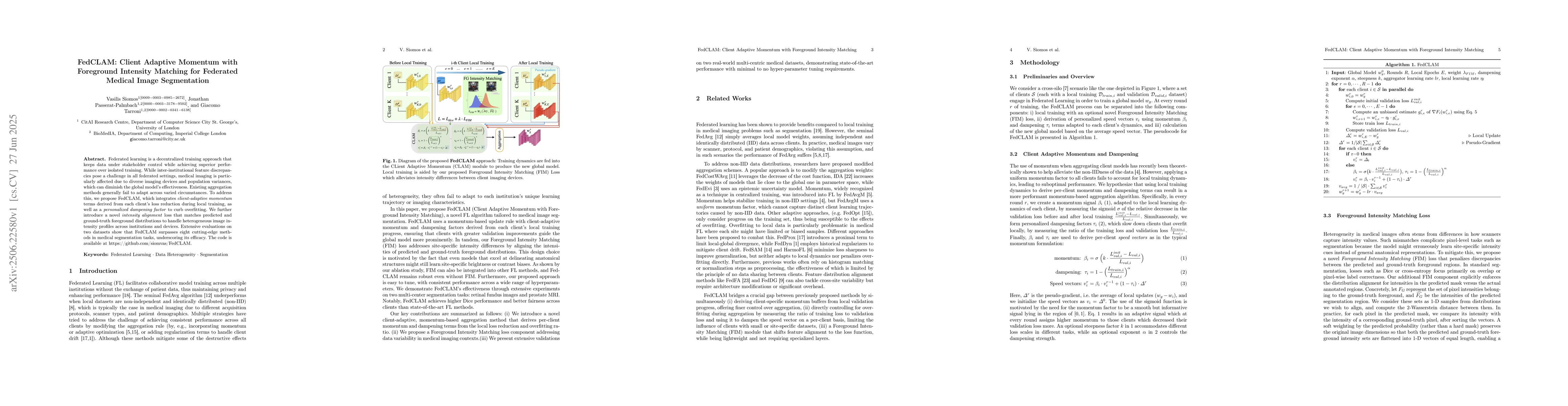 Federated learning is a decentralized training approach that keeps data under stakeholder control while achieving superior performance over isolated training. While inter-institutional feature discrepancies pose a challenge in all federated settings, medical imaging is particularly affected due to diverse imaging devices and population variances, which can diminish the global model's effectiveness. Existing aggregation methods generally fail to adapt across varied circumstances. To address this, we propose FedCLAM, which integrates \textit{client-adaptive momentum} terms derived from each client's loss reduction during local training, as well as a \textit{personalized dampening factor} to curb overfitting. We further introduce a novel \textit{intensity alignment} loss that matches predicted and ground-truth foreground distributions to handle heterogeneous image intensity profiles across institutions and devices. Extensive evaluations on two datasets show that FedCLAM surpasses eight cutting-edge methods in medical segmentation tasks, underscoring its efficacy. The code is available at https://github.com/siomvas/FedCLAM.