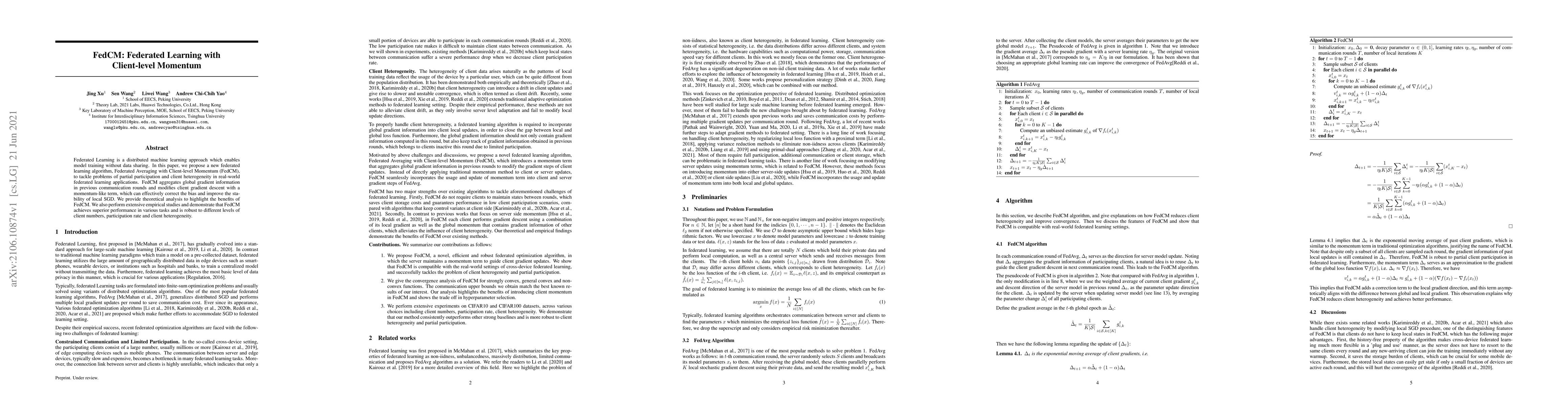 The paper proposes FedCM, a federated learning algorithm that addresses partial participation and client heterogeneity by incorporating client-level momentum to stabilize local SGD and improve model training. Empirical results show that FedCM outperforms existing methods across various tasks and conditions.
