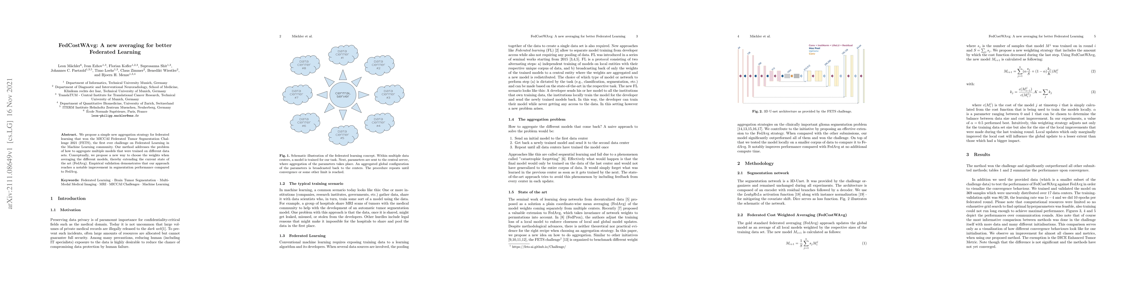 Title: FedCostWAvg: A new averaging for better Federated Learning Summary: This paper introduces a novel aggregation strategy called FedCostWAvg for federated learning, which outperformed FedAvg in the MICCAI Federated Tumor Segmentation Challenge 2021, demonstrating significant improvements in segmentation performance.