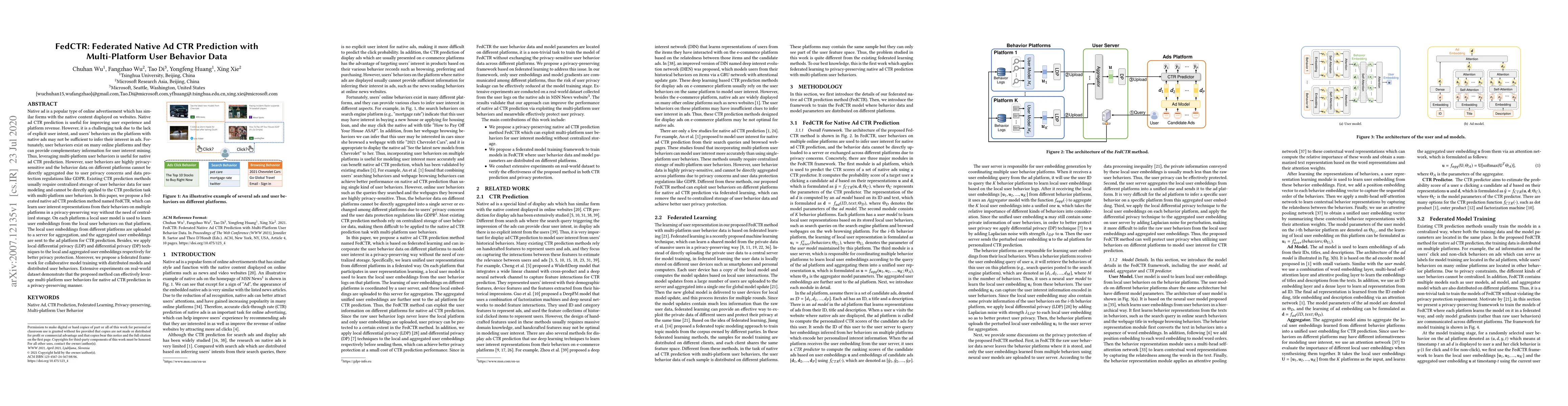 FedCTR proposes a federated learning method for predicting native ad click-through rates (CTR) by leveraging multi-platform user behavior data while ensuring user privacy through techniques like Local Differential Privacy (LDP) and Differential Privacy (DP). The method aggregates local user embeddings from different platforms for effective CTR prediction without compromising user privacy.