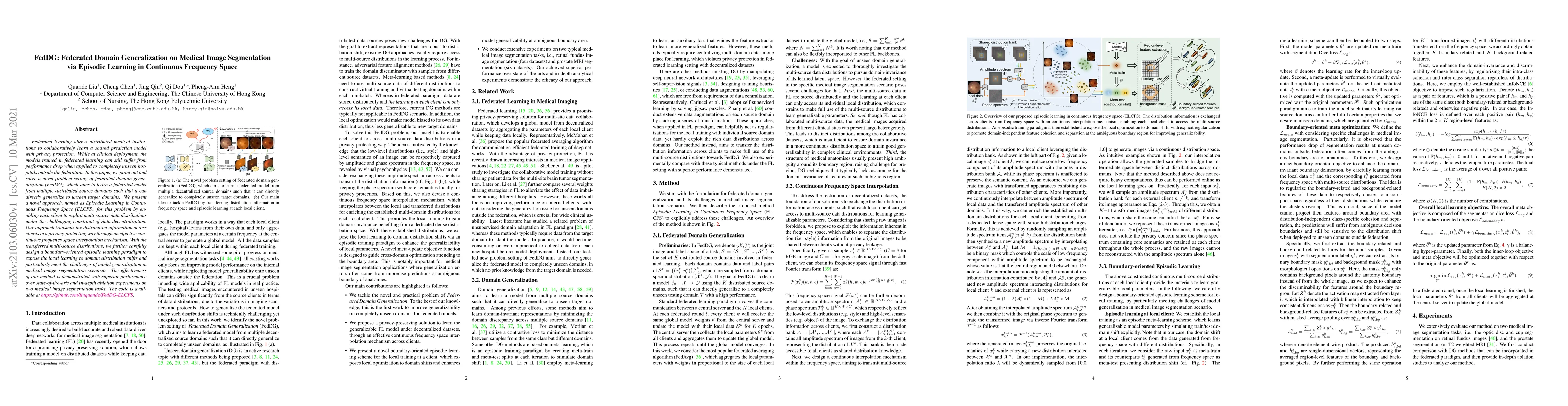 This paper introduces FedDG, a federated domain generalization method for medical image segmentation using Episodic Learning in Continuous Frequency Space (ELCFS). The approach enables distributed institutions to collaboratively learn a model that can generalize to unseen hospitals, addressing the challenge of data decentralization through a privacy-protecting frequency space interpolation mechanism.
