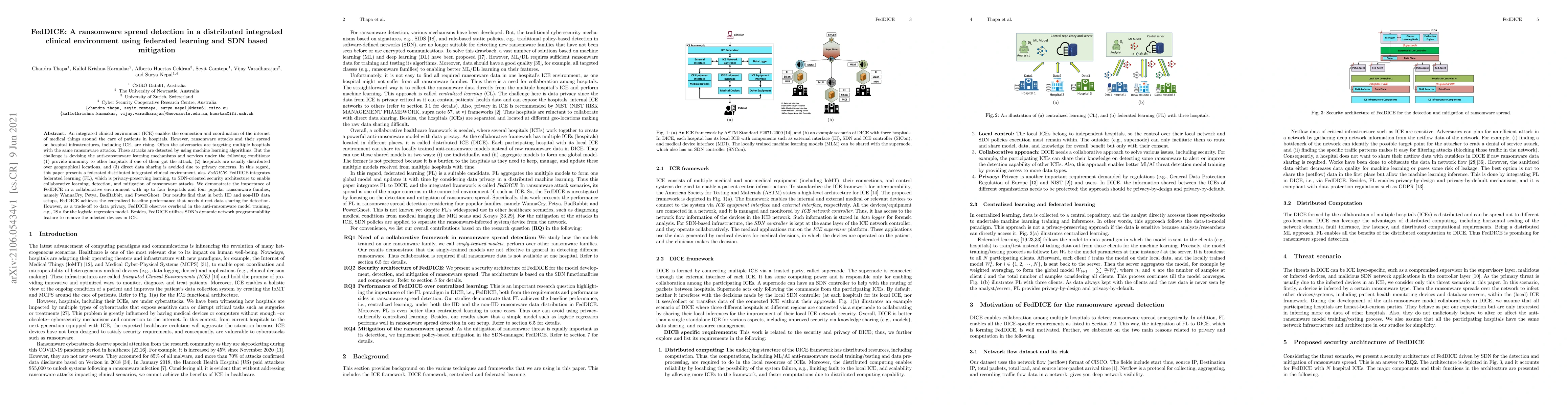 FedDICE employs federated learning and SDN to detect and mitigate ransomware in distributed clinical environments, achieving performance comparable to centralized methods while preserving data privacy. However, it incurs significant training overhead and leverages SDN for dynamic network-based mitigation.
