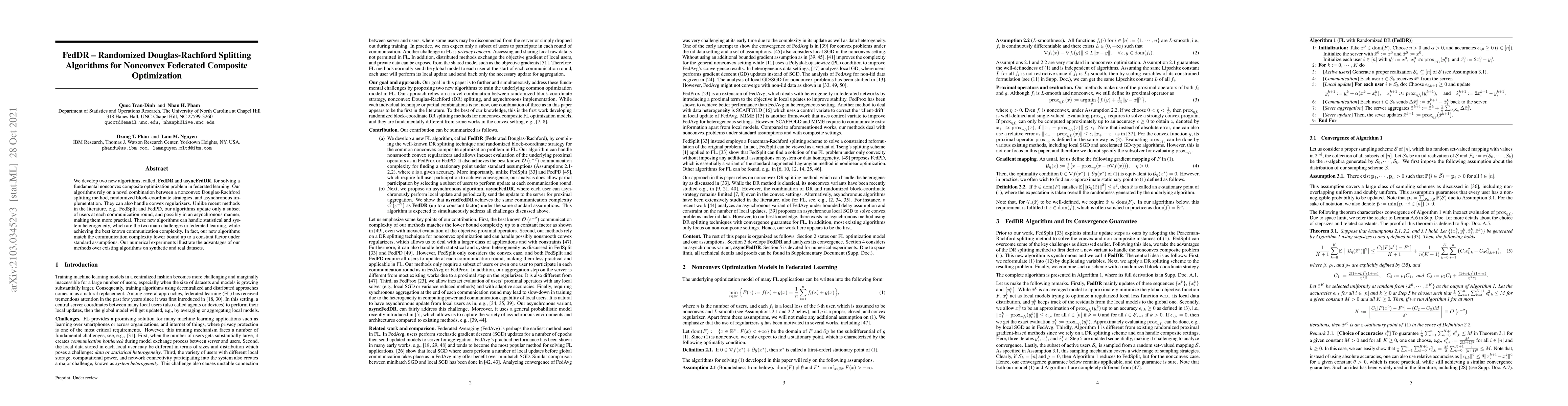 FedDR and asyncFedDR algorithms introduce a novel combination of nonconvex Douglas-Rachford splitting, randomized block-coordinate strategies, and asynchronous updates to tackle nonconvex composite optimization in federated learning. They achieve optimal communication complexity and handle heterogeneity, outperforming existing methods in practical scenarios.
