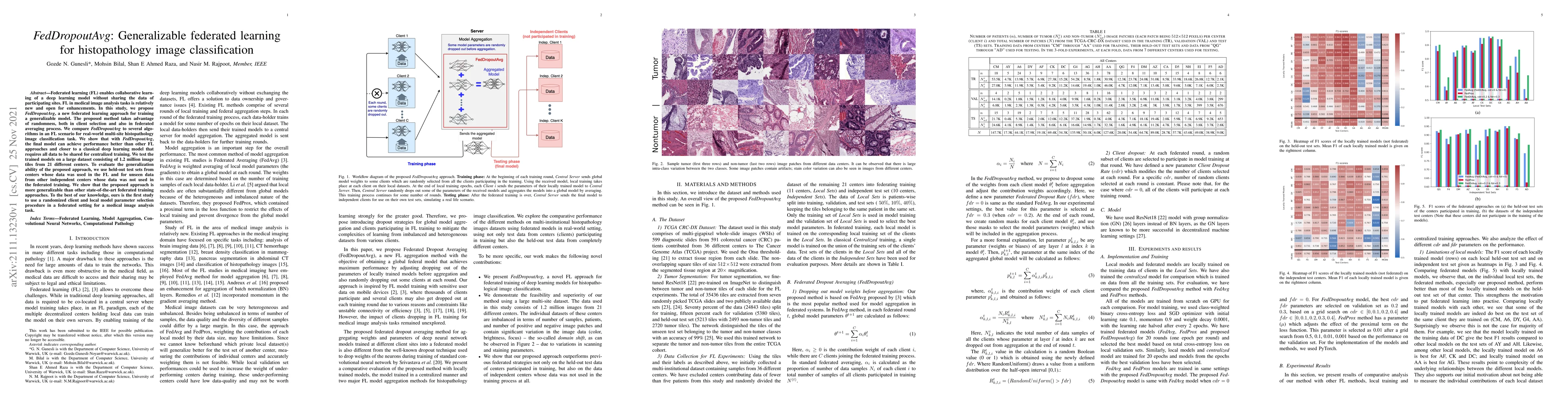 This paper proposes FedDropoutAvg, a novel federated learning method for histopathology image classification that enhances generalizability through randomized client and model selection. The method outperforms other federated learning approaches and shows better generalization to unseen data from independent centers.