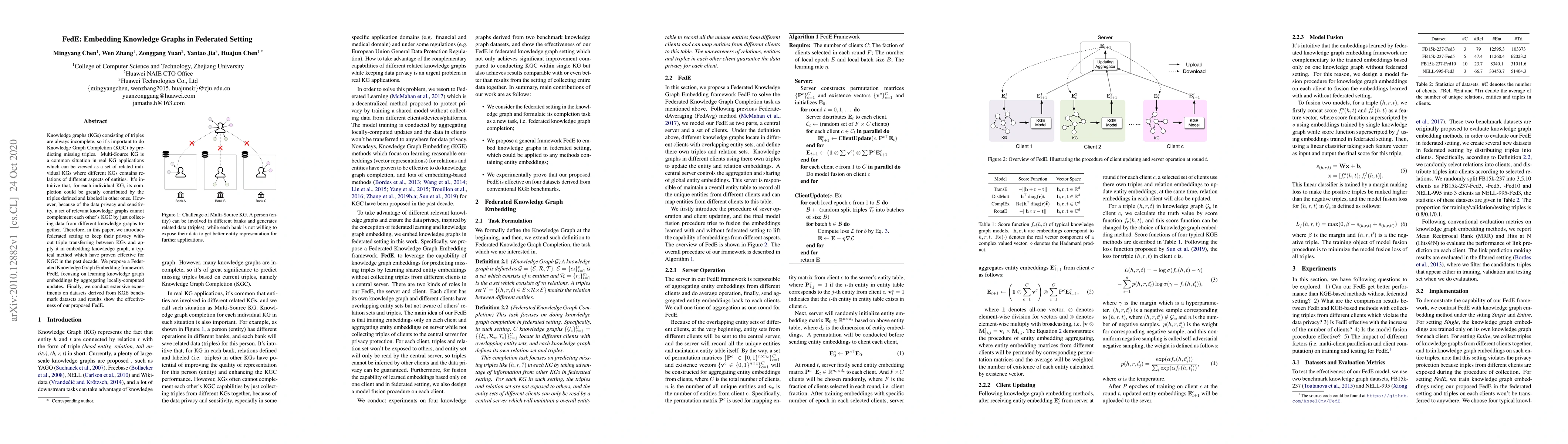 The paper introduces FedE, a Federated Knowledge Graph Embedding framework that enables privacy-preserving Knowledge Graph Completion in a multi-source setting without transferring data between graphs. FedE aggregates locally-computed updates to learn embeddings, demonstrating effectiveness through experiments on KGE benchmark datasets.