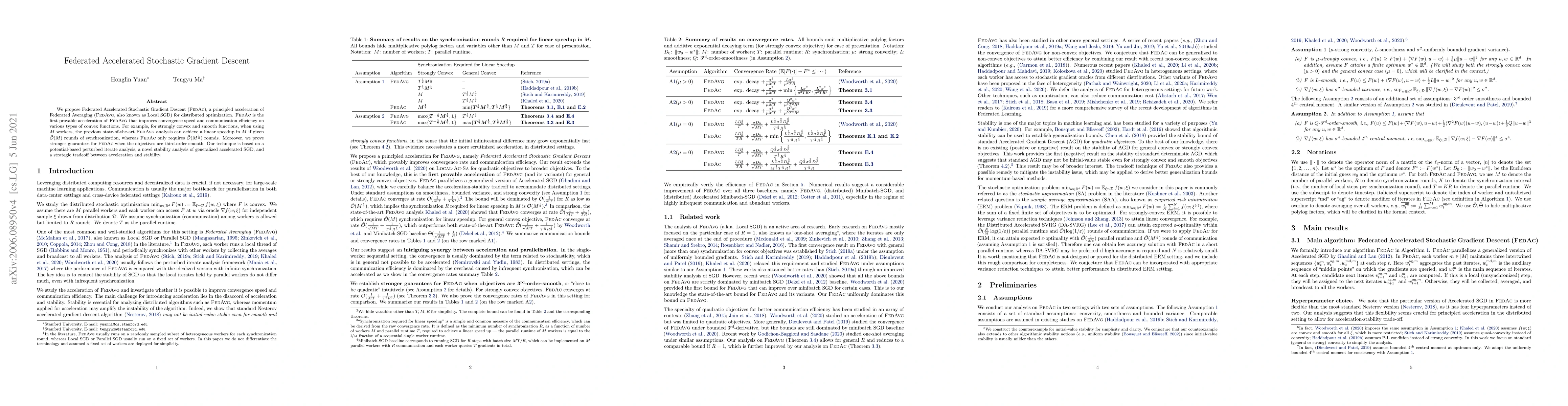 This paper introduces Federated Accelerated Stochastic Gradient Descent (FedAc), an accelerated version of Federated Averaging that enhances convergence speed and communication efficiency. FedAc achieves a significant reduction in synchronization rounds compared to FedAvg, offering stronger guarantees for third-order smooth objectives.