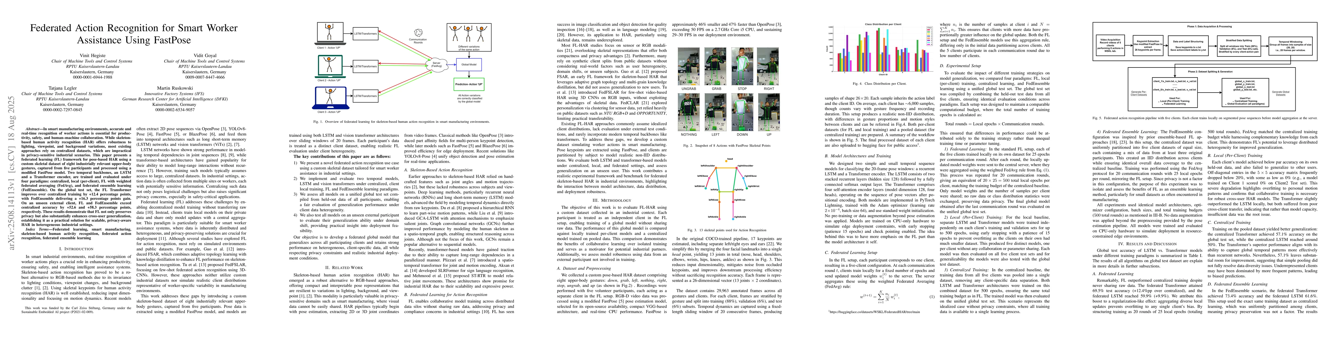 In smart manufacturing environments, accurate and real-time recognition of worker actions is essential for productivity, safety, and human-machine collaboration. While skeleton-based human activity recognition (HAR) offers robustness to lighting, viewpoint, and background variations, most existing approaches rely on centralized datasets, which are impractical in privacy-sensitive industrial scenarios. This paper presents a federated learning (FL) framework for pose-based HAR using a custom skeletal dataset of eight industrially relevant upper-body gestures, captured from five participants and processed using a modified FastPose model. Two temporal backbones, an LSTM and a Transformer encoder, are trained and evaluated under four paradigms: centralized, local (per-client), FL with weighted federated averaging (FedAvg), and federated ensemble learning (FedEnsemble). On the global test set, the FL Transformer improves over centralized training by +12.4 percentage points, with FedEnsemble delivering a +16.3 percentage points gain. On an unseen external client, FL and FedEnsemble exceed centralized accuracy by +52.6 and +58.3 percentage points, respectively. These results demonstrate that FL not only preserves privacy but also substantially enhances cross-user generalization, establishing it as a practical solution for scalable, privacy-aware HAR in heterogeneous industrial settings.