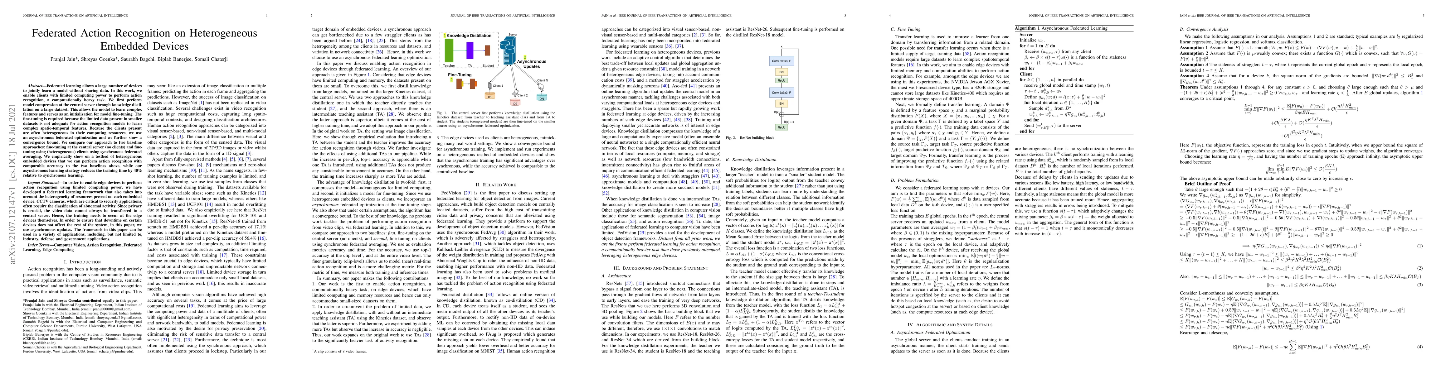 Federated learning allows a large number of devices to jointly learn a model without sharing data. In this work, we enable clients with limited computing power to perform action recognition, a computationally heavy task. We first perform model compression at the central server through knowledge distillation on a large dataset. This allows the model to learn complex features and serves as an initialization for model fine-tuning. The fine-tuning is required because the limited data present in smaller datasets is not adequate for action recognition models to learn complex spatio-temporal features. Because the clients present are often heterogeneous in their computing resources, we use an asynchronous federated optimization and we further show a convergence bound. We compare our approach to two baseline approaches: fine-tuning at the central server (no clients) and fine-tuning using (heterogeneous) clients using synchronous federated averaging. We empirically show on a testbed of heterogeneous embedded devices that we can perform action recognition with comparable accuracy to the two baselines above, while our asynchronous learning strategy reduces the training time by 40%, relative to synchronous learning.