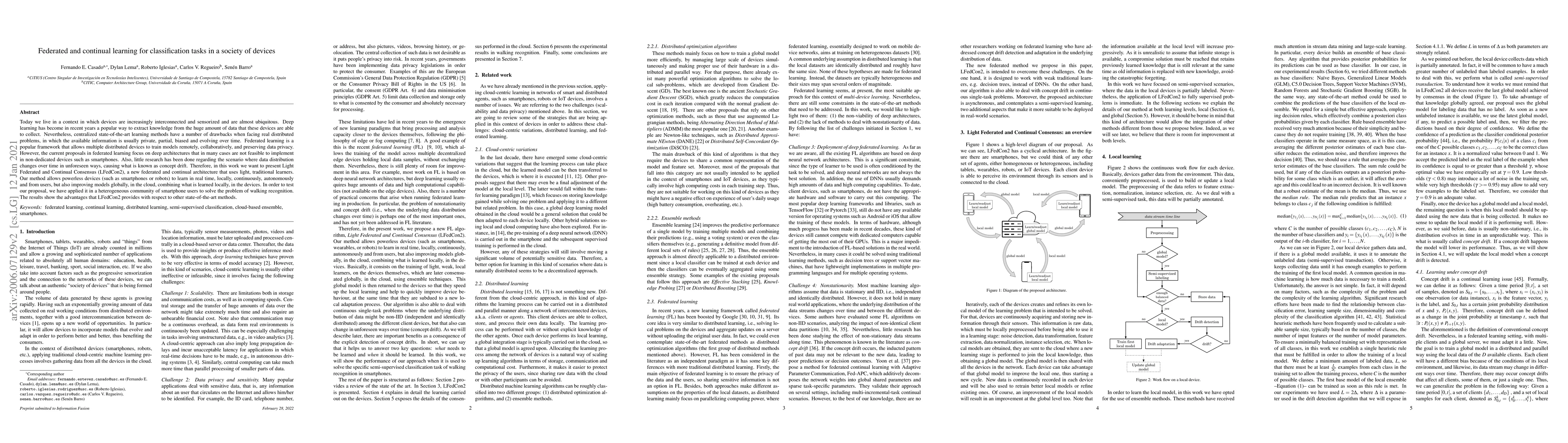 Today we live in a context in which devices are increasingly interconnected and sensorized and are almost ubiquitous. Deep learning has become in recent years a popular way to extract knowledge from the huge amount of data that these devices are able to collect. Nevertheless, centralized state-of-the-art learning methods have a number of drawbacks when facing real distributed problems, in which the available information is usually private, partial, biased and evolving over time. Federated learning is a popular framework that allows multiple distributed devices to train models remotely, collaboratively, and preserving data privacy. However, the current proposals in federated learning focus on deep architectures that in many cases are not feasible to implement in non-dedicated devices such as smartphones. Also, little research has been done regarding the scenario where data distribution changes over time in unforeseen ways, causing what is known as concept drift. Therefore, in this work we want to present Light Federated and Continual Consensus (LFedCon2), a new federated and continual architecture that uses light, traditional learners. Our method allows powerless devices (such as smartphones or robots) to learn in real time, locally, continuously, autonomously and from users, but also improving models globally, in the cloud, combining what is learned locally, in the devices. In order to test our proposal, we have applied it in a heterogeneous community of smartphone users to solve the problem of walking recognition. The results show the advantages that LFedCon2 provides with respect to other state-of-the-art methods.