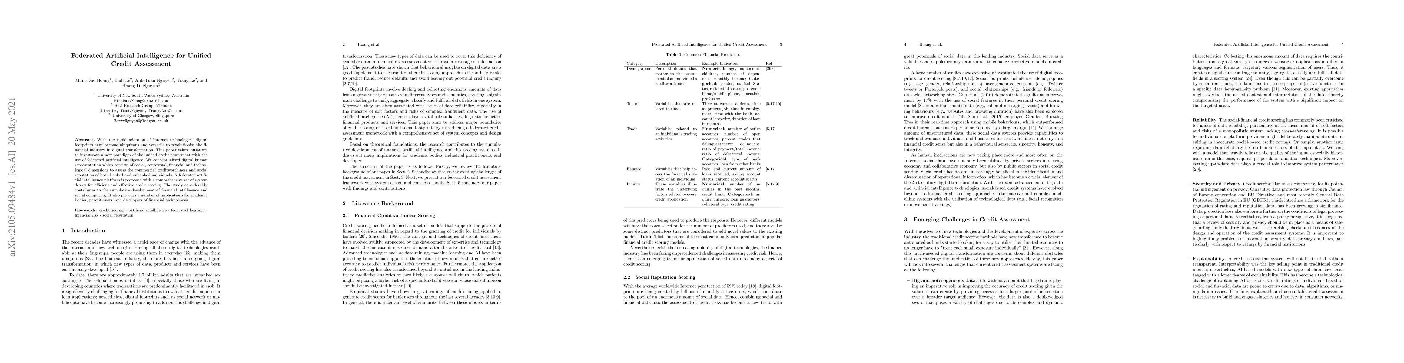 With the rapid adoption of Internet technologies, digital footprints have become ubiquitous and versatile to revolutionise the financial industry in digital transformation. This paper takes initiatives to investigate a new paradigm of the unified credit assessment with the use of federated artificial intelligence. We conceptualised digital human representation which consists of social, contextual, financial and technological dimensions to assess the commercial creditworthiness and social reputation of both banked and unbanked individuals. A federated artificial intelligence platform is proposed with a comprehensive set of system design for efficient and effective credit scoring. The study considerably contributes to the cumulative development of financial intelligence and social computing. It also provides a number of implications for academic bodies, practitioners, and developers of financial technologies.