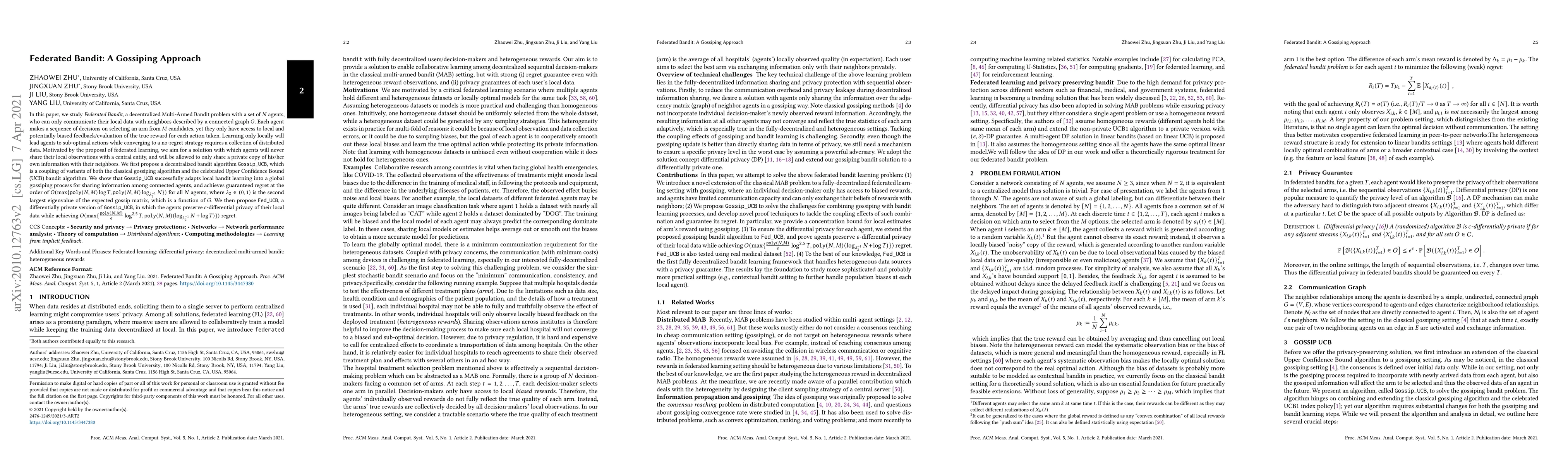 Researchers developed a decentralized algorithm, Gossip_UCB, for Federated Bandit problems where agents can only share private information with neighbors, achieving guaranteed regret at an affordable rate. A differentially private version, Fed_UCB, preserves local data privacy while maintaining performance.