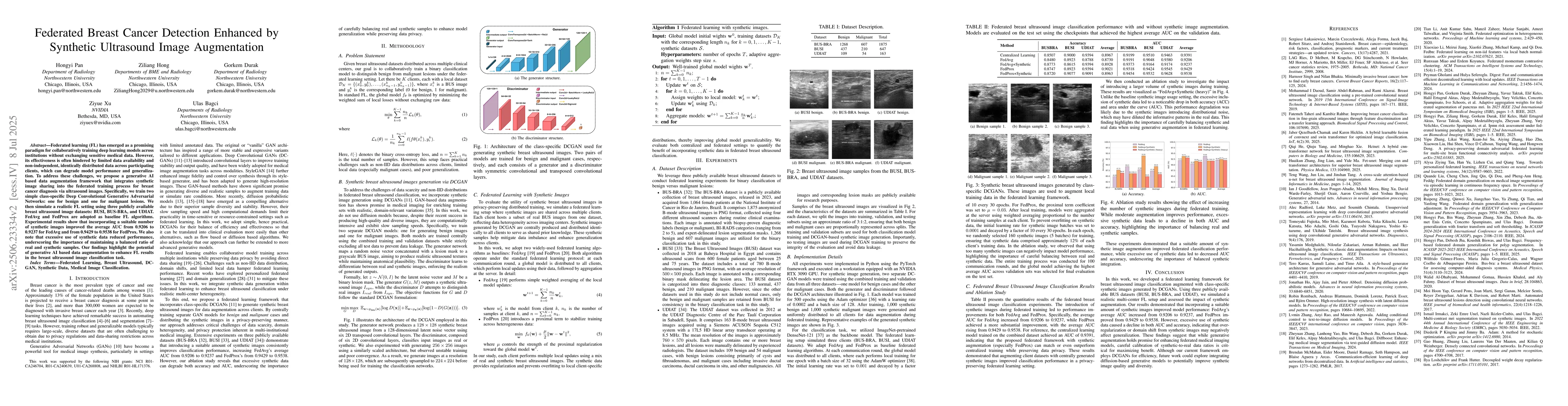 Federated learning (FL) has emerged as a promising paradigm for collaboratively training deep learning models across institutions without exchanging sensitive medical data. However, its effectiveness is often hindered by limited data availability and non-independent, identically distributed data across participating clients, which can degrade model performance and generalization. To address these challenges, we propose a generative AI based data augmentation framework that integrates synthetic image sharing into the federated training process for breast cancer diagnosis via ultrasound images. Specifically, we train two simple class-specific Deep Convolutional Generative Adversarial Networks: one for benign and one for malignant lesions. We then simulate a realistic FL setting using three publicly available breast ultrasound image datasets: BUSI, BUS-BRA, and UDIAT. FedAvg and FedProx are adopted as baseline FL algorithms. Experimental results show that incorporating a suitable number of synthetic images improved the average AUC from 0.9206 to 0.9237 for FedAvg and from 0.9429 to 0.9538 for FedProx. We also note that excessive use of synthetic data reduced performance, underscoring the importance of maintaining a balanced ratio of real and synthetic samples. Our findings highlight the potential of generative AI based data augmentation to enhance FL results in the breast ultrasound image classification task.