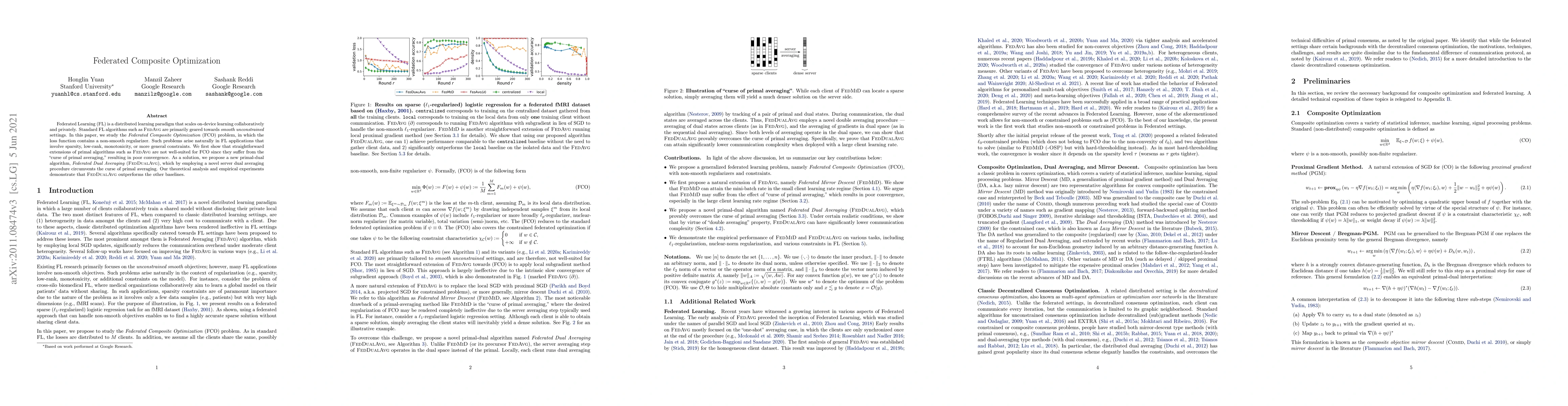 Federated Learning (FL) is a distributed learning paradigm that scales on-device learning collaboratively and privately. Standard FL algorithms such as FedAvg are primarily geared towards smooth unconstrained settings. In this paper, we study the Federated Composite Optimization (FCO) problem, in which the loss function contains a non-smooth regularizer. Such problems arise naturally in FL applications that involve sparsity, low-rank, monotonicity, or more general constraints. We first show that straightforward extensions of primal algorithms such as FedAvg are not well-suited for FCO since they suffer from the "curse of primal averaging," resulting in poor convergence. As a solution, we propose a new primal-dual algorithm, Federated Dual Averaging (FedDualAvg), which by employing a novel server dual averaging procedure circumvents the curse of primal averaging. Our theoretical analysis and empirical experiments demonstrate that FedDualAvg outperforms the other baselines.
