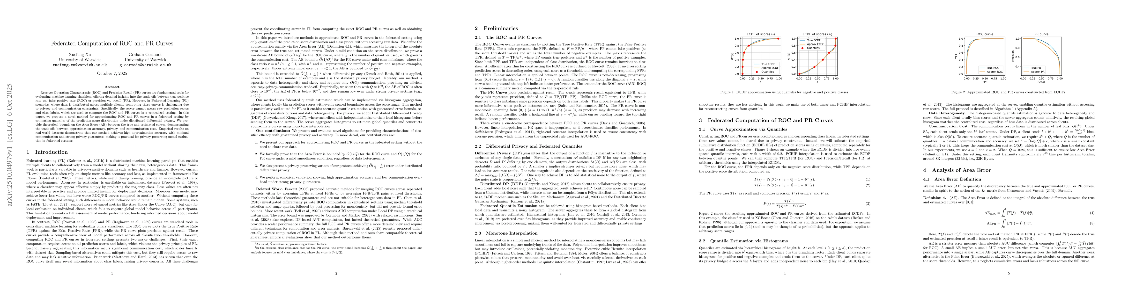 First rigorous theoretical analysis of privacy-preserving ROC/PR curve construction in federated settings, combining quantile estimation error bounds with differential privacy guarantees and secure aggregation mechanisms.