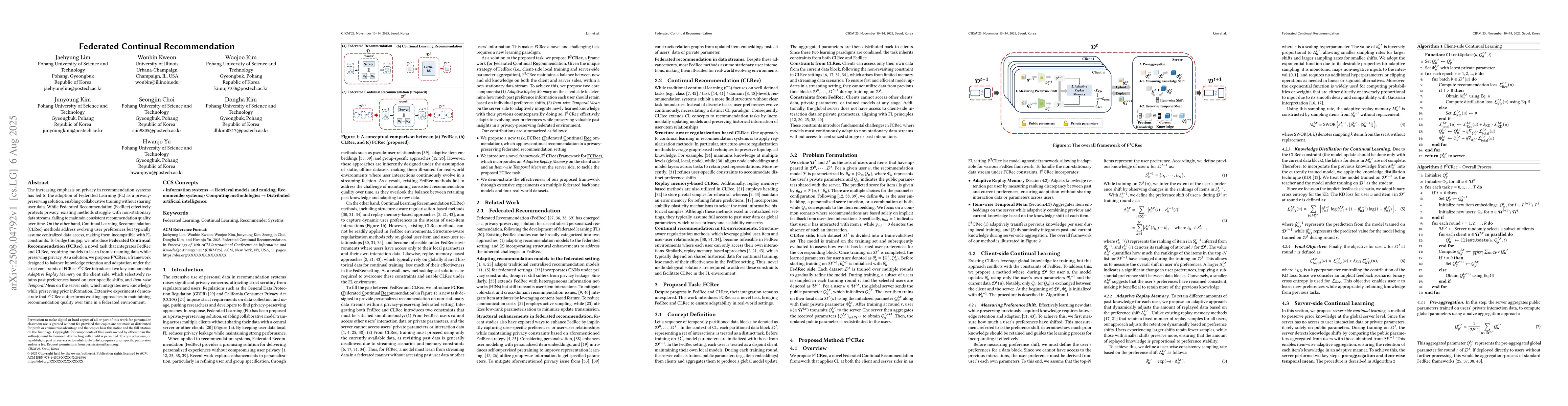 The increasing emphasis on privacy in recommendation systems has led to the adoption of Federated Learning (FL) as a privacy-preserving solution, enabling collaborative training without sharing user data. While Federated Recommendation (FedRec) effectively protects privacy, existing methods struggle with non-stationary data streams, failing to maintain consistent recommendation quality over time. On the other hand, Continual Learning Recommendation (CLRec) methods address evolving user preferences but typically assume centralized data access, making them incompatible with FL constraints. To bridge this gap, we introduce Federated Continual Recommendation (FCRec), a novel task that integrates FedRec and CLRec, requiring models to learn from streaming data while preserving privacy. As a solution, we propose F3CRec, a framework designed to balance knowledge retention and adaptation under the strict constraints of FCRec. F3CRec introduces two key components: Adaptive Replay Memory on the client side, which selectively retains past preferences based on user-specific shifts, and Item-wise Temporal Mean on the server side, which integrates new knowledge while preserving prior information. Extensive experiments demonstrate that F3CRec outperforms existing approaches in maintaining recommendation quality over time in a federated environment.