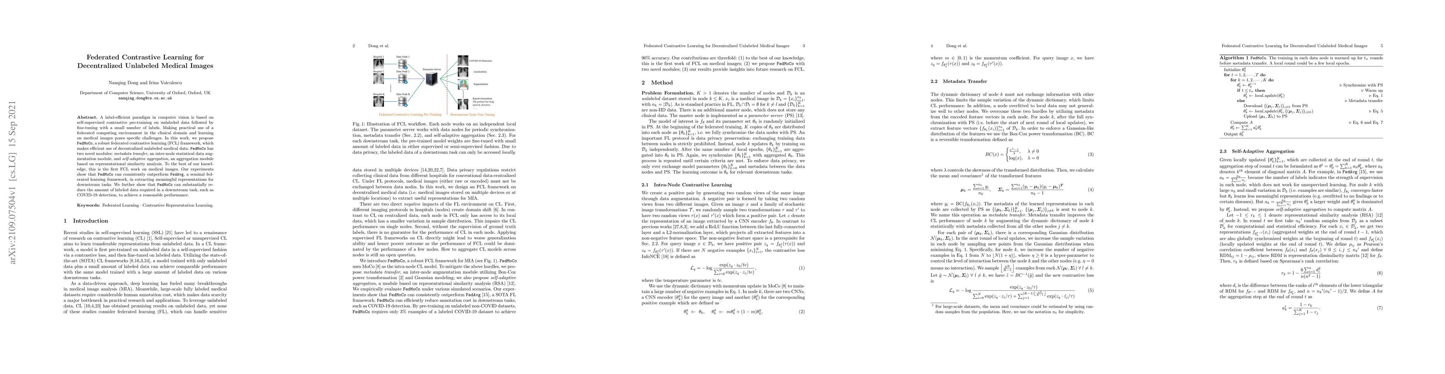 This paper proposes FedMoCo, a federated contrastive learning framework for decentralized unlabeled medical images, featuring metadata transfer and self-adaptive aggregation modules. FedMoCo outperforms FedAvg in extracting meaningful representations and requires less labeled data for tasks like COVID-19 detection.
