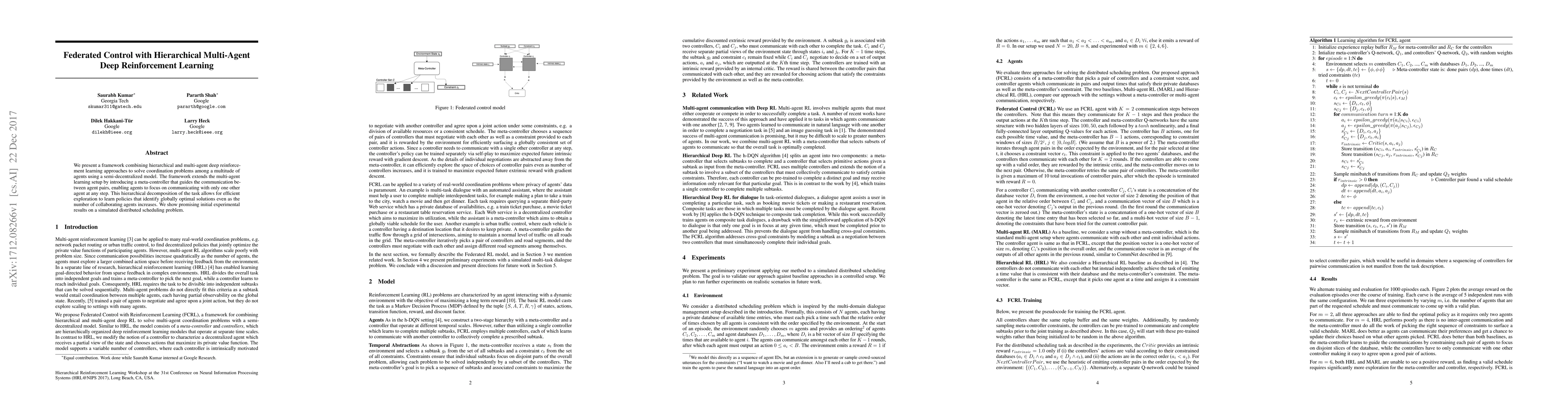 This paper proposes a federated control framework that integrates hierarchical and multi-agent deep reinforcement learning to coordinate numerous agents in a semi-decentralized model. The framework employs a meta-controller to facilitate communication between agent pairs, enabling efficient exploration and learning of globally optimal solutions, demonstrated through initial experiments in distributed scheduling.
