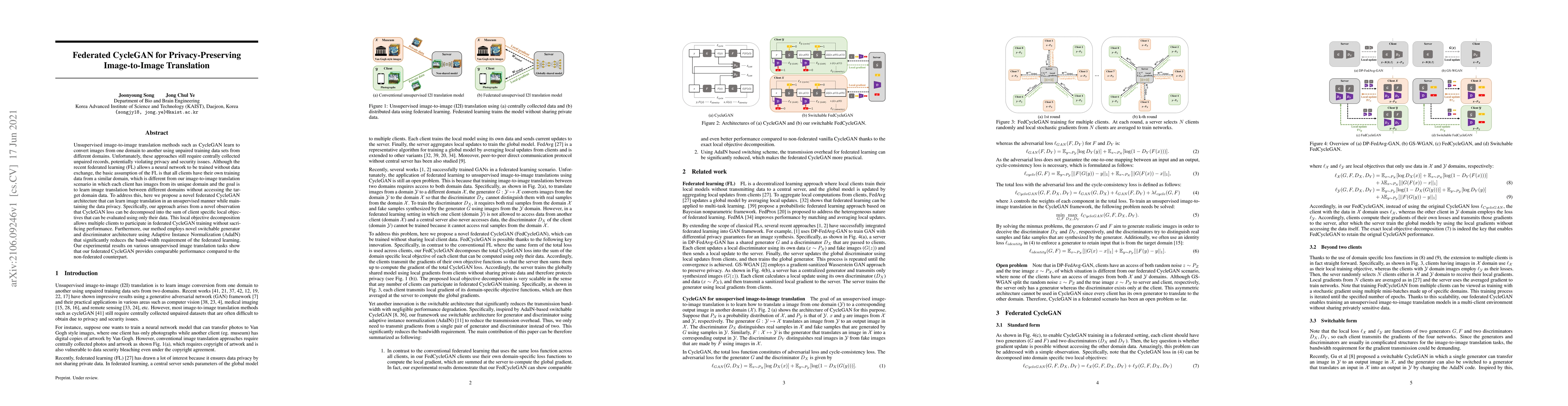 This paper proposes a federated CycleGAN architecture for privacy-preserving image-to-image translation, enabling training without central data collection. It decomposes CycleGAN loss into local objectives, allowing multiple clients to train without sharing data, while employing adaptive instance normalization to reduce bandwidth requirements.