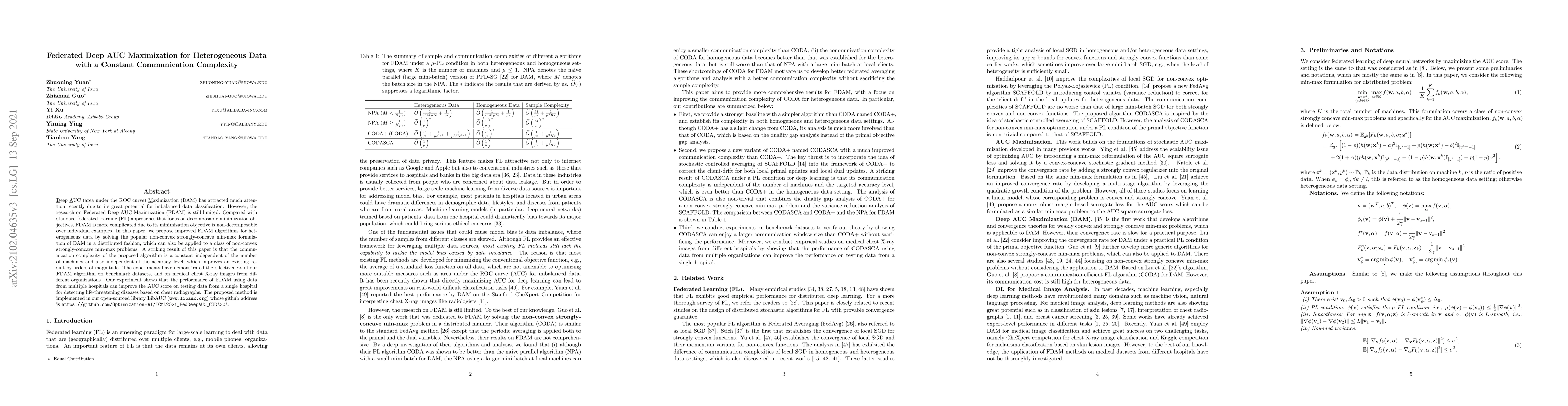 Deep AUC (area under the ROC curve) Maximization (DAM) has attracted much attention recently due to its great potential for imbalanced data classification. However, the research on Federated Deep AUC Maximization (FDAM) is still limited. Compared with standard federated learning (FL) approaches that focus on decomposable minimization objectives, FDAM is more complicated due to its minimization objective is non-decomposable over individual examples. In this paper, we propose improved FDAM algorithms for heterogeneous data by solving the popular non-convex strongly-concave min-max formulation of DAM in a distributed fashion, which can also be applied to a class of non-convex strongly-concave min-max problems. A striking result of this paper is that the communication complexity of the proposed algorithm is a constant independent of the number of machines and also independent of the accuracy level, which improves an existing result by orders of magnitude. The experiments have demonstrated the effectiveness of our FDAM algorithm on benchmark datasets, and on medical chest X-ray images from different organizations. Our experiment shows that the performance of FDAM using data from multiple hospitals can improve the AUC score on testing data from a single hospital for detecting life-threatening diseases based on chest radiographs. The proposed method is implemented in our open-sourced library LibAUC (www.libauc.org) whose github address is https://github.com/Optimization-AI/ICML2021_FedDeepAUC_CODASCA.