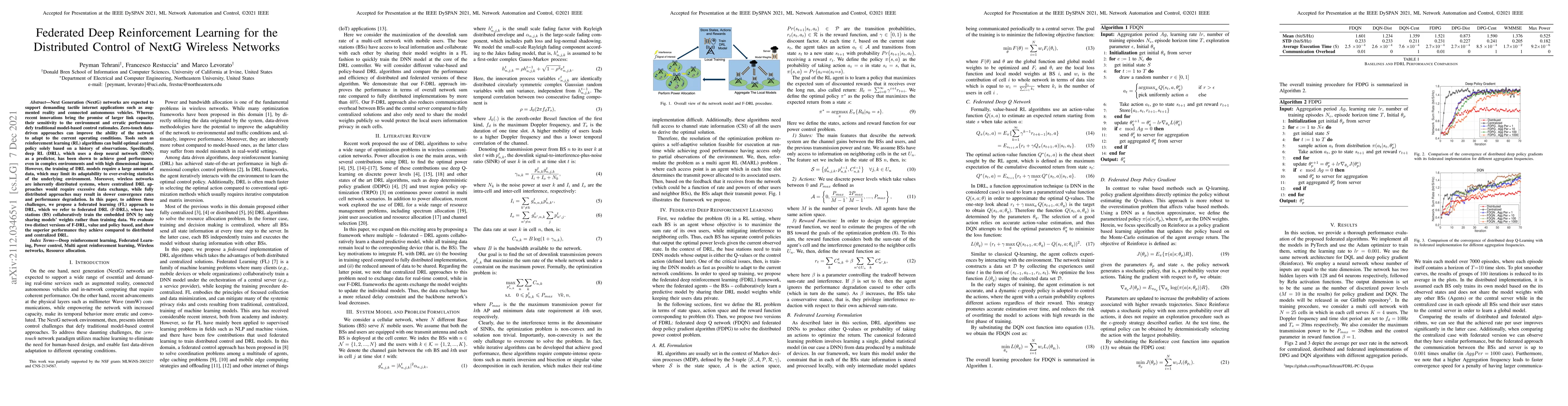 This paper proposes a federated deep reinforcement learning (F-DRL) approach to optimize the distributed control of Next Generation wireless networks, leveraging collaborative training of deep neural networks among base stations by sharing model weights instead of data. The study evaluates value-based and policy-based F-DRL models, demonstrating their superior performance over distributed and centralized deep RL approaches.