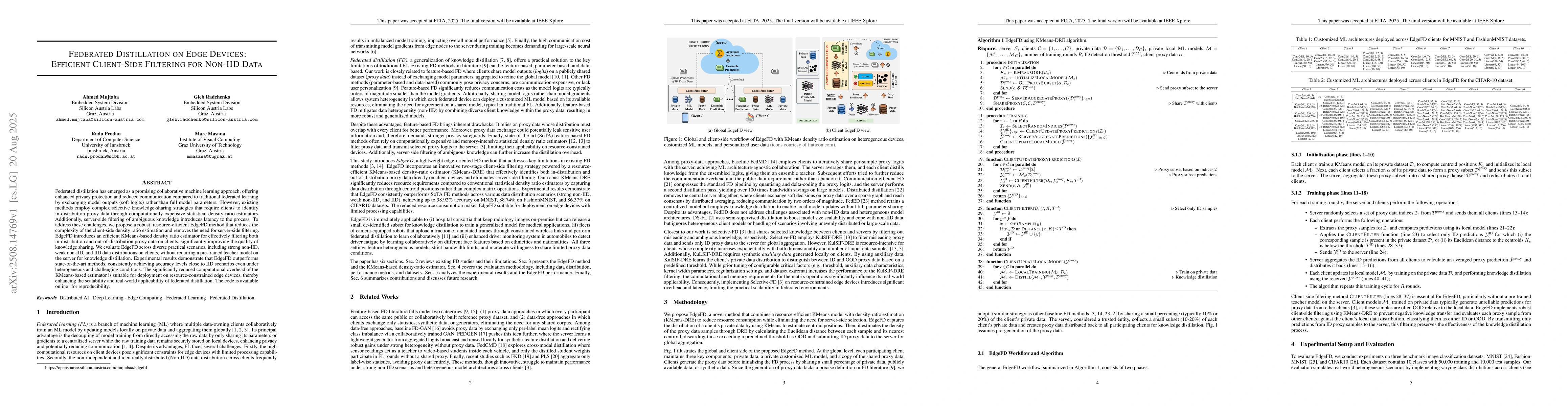 Federated distillation has emerged as a promising collaborative machine learning approach, offering enhanced privacy protection and reduced communication compared to traditional federated learning by exchanging model outputs (soft logits) rather than full model parameters. However, existing methods employ complex selective knowledge-sharing strategies that require clients to identify in-distribution proxy data through computationally expensive statistical density ratio estimators. Additionally, server-side filtering of ambiguous knowledge introduces latency to the process. To address these challenges, we propose a robust, resource-efficient EdgeFD method that reduces the complexity of the client-side density ratio estimation and removes the need for server-side filtering. EdgeFD introduces an efficient KMeans-based density ratio estimator for effectively filtering both in-distribution and out-of-distribution proxy data on clients, significantly improving the quality of knowledge sharing. We evaluate EdgeFD across diverse practical scenarios, including strong non-IID, weak non-IID, and IID data distributions on clients, without requiring a pre-trained teacher model on the server for knowledge distillation. Experimental results demonstrate that EdgeFD outperforms state-of-the-art methods, consistently achieving accuracy levels close to IID scenarios even under heterogeneous and challenging conditions. The significantly reduced computational overhead of the KMeans-based estimator is suitable for deployment on resource-constrained edge devices, thereby enhancing the scalability and real-world applicability of federated distillation. The code is available online for reproducibility.