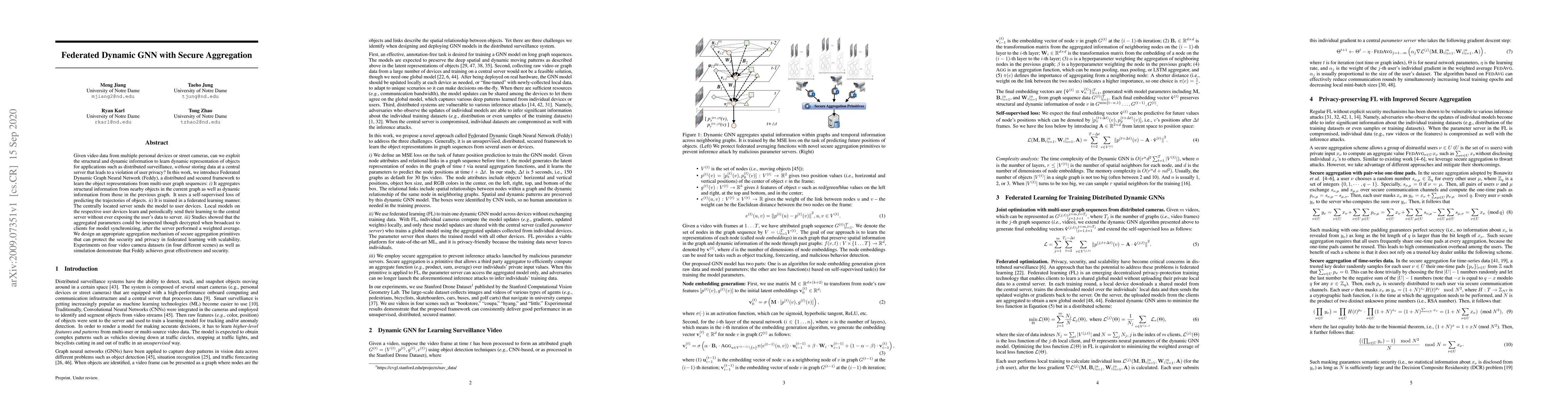 Given video data from multiple personal devices or street cameras, can we exploit the structural and dynamic information to learn dynamic representation of objects for applications such as distributed surveillance, without storing data at a central server that leads to a violation of user privacy? In this work, we introduce Federated Dynamic Graph Neural Network (Feddy), a distributed and secured framework to learn the object representations from multi-user graph sequences: i) It aggregates structural information from nearby objects in the current graph as well as dynamic information from those in the previous graph. It uses a self-supervised loss of predicting the trajectories of objects. ii) It is trained in a federated learning manner. The centrally located server sends the model to user devices. Local models on the respective user devices learn and periodically send their learning to the central server without ever exposing the user's data to server. iii) Studies showed that the aggregated parameters could be inspected though decrypted when broadcast to clients for model synchronizing, after the server performed a weighted average. We design an appropriate aggregation mechanism of secure aggregation primitives that can protect the security and privacy in federated learning with scalability. Experiments on four video camera datasets (in four different scenes) as well as simulation demonstrate that Feddy achieves great effectiveness and security.