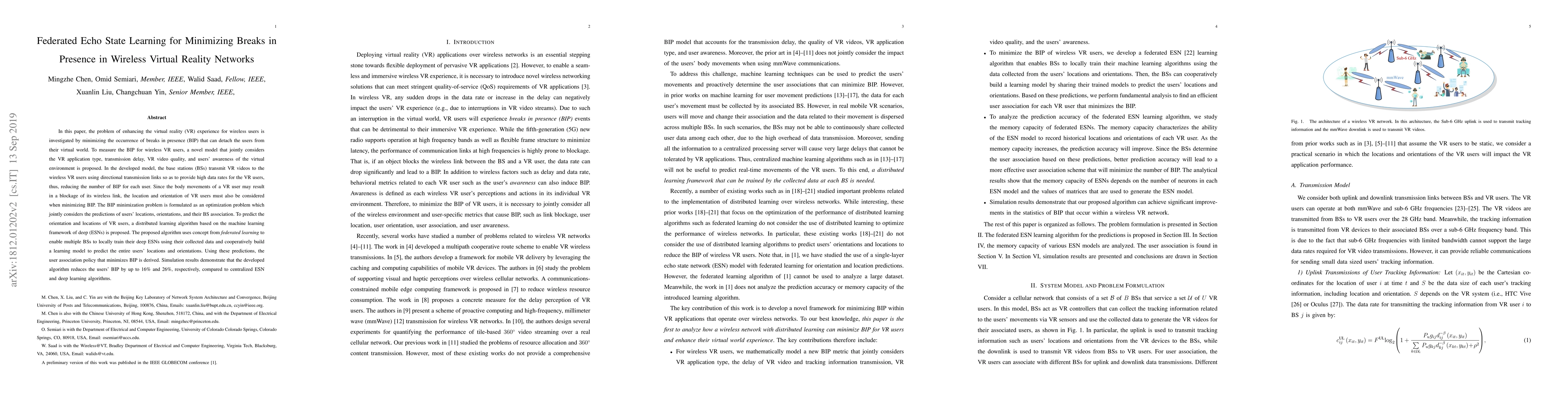 This paper proposes a federated echo state network (ESN) learning approach to minimize breaks in presence (BIP) in wireless virtual reality networks by optimizing user location and orientation predictions. The developed BIP model considers VR application type, transmission delay, video quality, and user awareness, aiming to reduce BIP through directional transmission links and optimized base station association policies. Simulation results show a significant reduction in BIP compared to centralized learning methods.