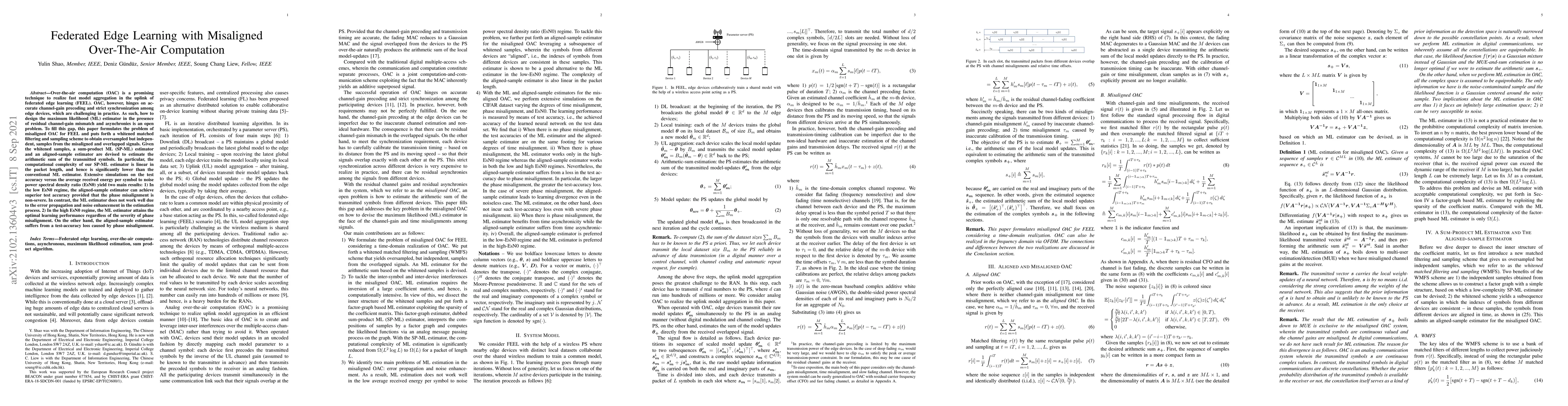 This paper addresses the challenge of designing a maximum likelihood estimator for federated edge learning under over-the-air computation with channel-gain mismatch and asynchrony. It proposes a whitened matched filtering scheme and introduces sum-product and aligned-sample estimators, showing that the sum-product estimator is more efficient and effective in high signal-to-noise ratio conditions, while the aligned-sample estimator performs better under low signal-to-noise ratios with non-severe phase misalignment.