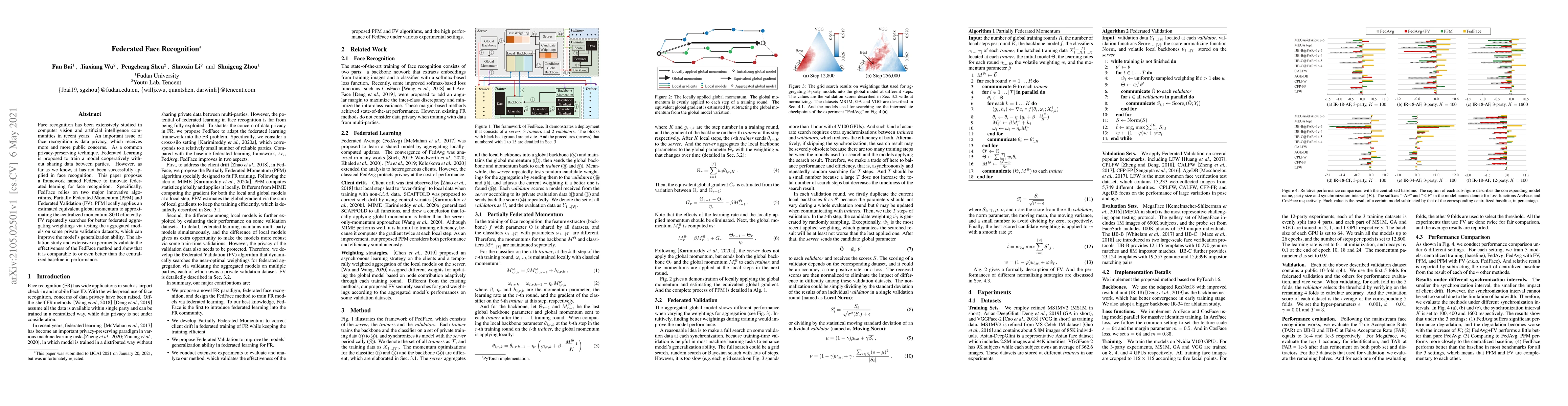 This paper introduces FedFace, a novel framework for federated face recognition that leverages Federated Learning to address data privacy concerns. It employs two key algorithms, Partially Federated Momentum and Federated Validation, to enhance model performance and generalization, demonstrating competitive results compared to centralized approaches.