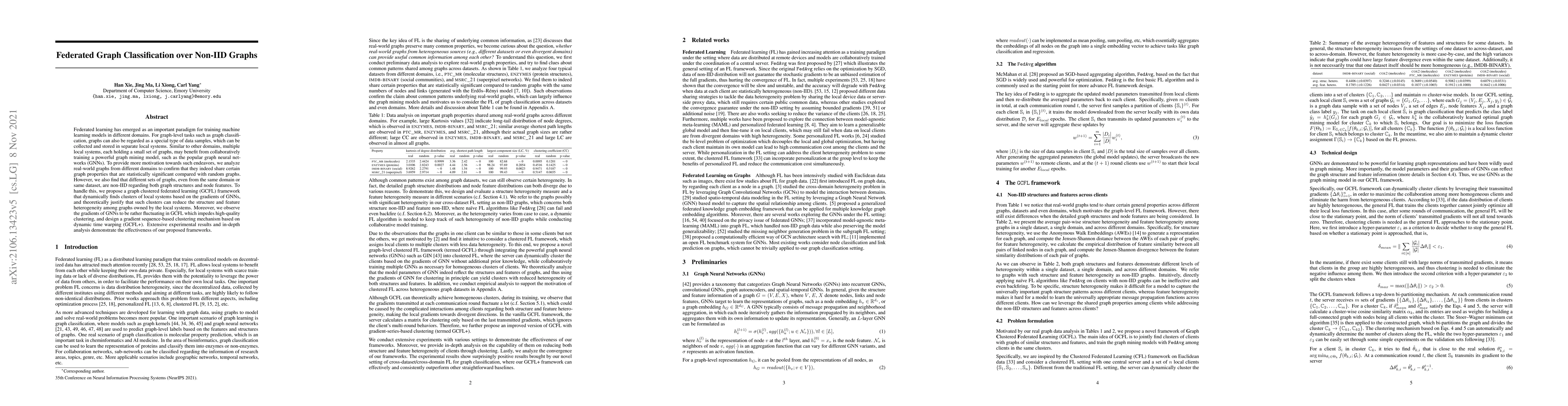 This paper proposes a federated learning framework for graph classification over non-IID graphs, introducing a graph clustered federated learning (GCFL) approach that dynamically clusters local systems based on GNN gradients to reduce heterogeneity. The authors further enhance the method with a gradient sequence-based clustering mechanism (GCFL+) to address fluctuating gradients, demonstrating improved performance through extensive experiments.