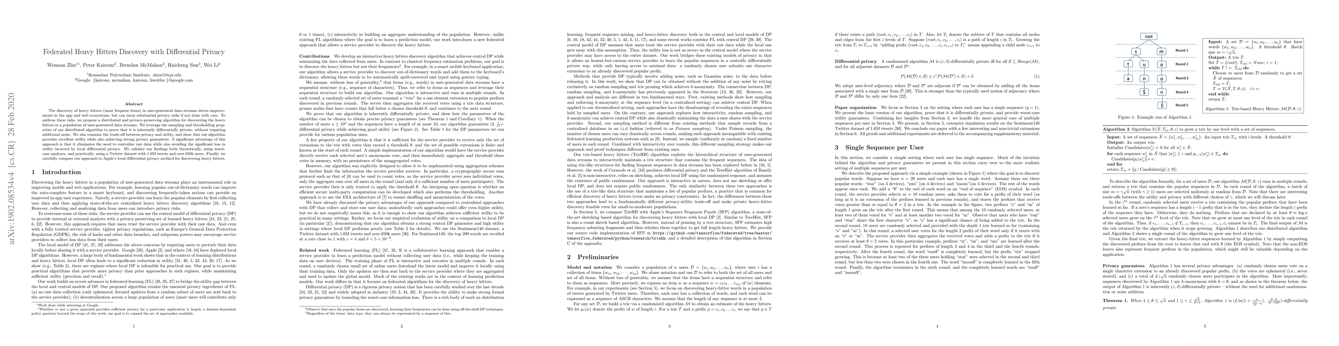 This paper proposes a distributed, differentially private algorithm for identifying heavy hitters in user-generated data streams, balancing privacy and utility without centralizing data. The method is validated theoretically and practically using a large Twitter dataset, demonstrating superior utility compared to local differential privacy approaches.