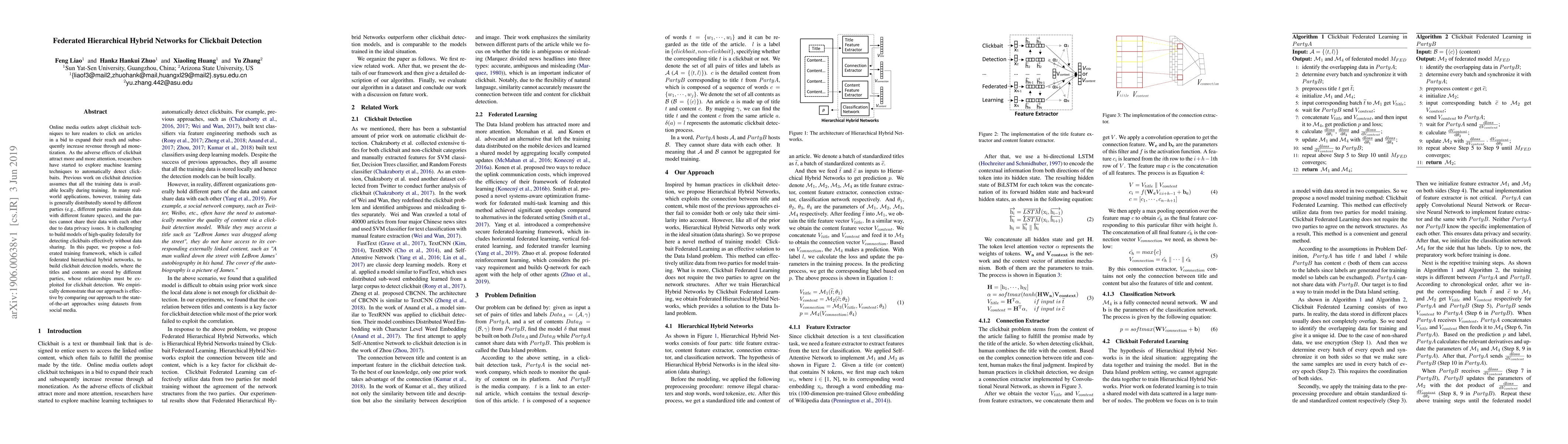 This paper proposes a federated hierarchical hybrid network framework for clickbait detection, addressing the challenge of training models on distributed data without sharing sensitive information. The approach demonstrates effective clickbait detection performance compared to state-of-the-art methods using social media datasets.
